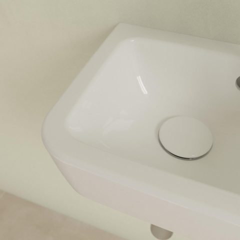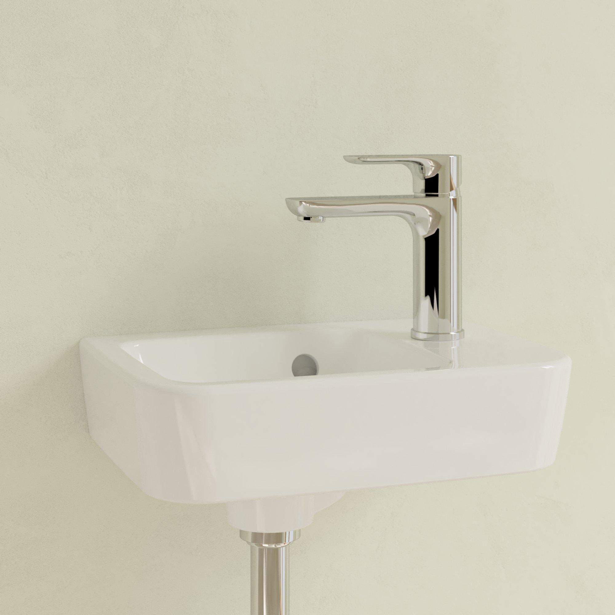 Avec une dimension d’environ 36x25 cm, ce petit lave-mains convient parfaitement aux toilettes compactes, aux petites niches ou à une petite salle de bains pour invités. La forme de base angulaire avec des angles subtilement arrondis crée une apparence moderne et intemporelle qui se marie bien avec différents styles, du minimaliste épuré au classique sobre. Comme le robinet est positionné sur le côté droit, la profondeur vers l’intérieur de la pièce reste limitée, ce qui offre une liberté de mouvement supplémentaire à l’entrée et lors des mouvements de rotation dans les toilettes. Vous utilisez ainsi l’espace disponible de manière optimale, sans que cela ne paraisse exigu.