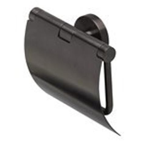 - Porte-rouleau de papier toilette moderne avec couvercle en métal noir brossé, parfaitement adapté à une salle de bains ou des toilettes épurées et contemporaines.
