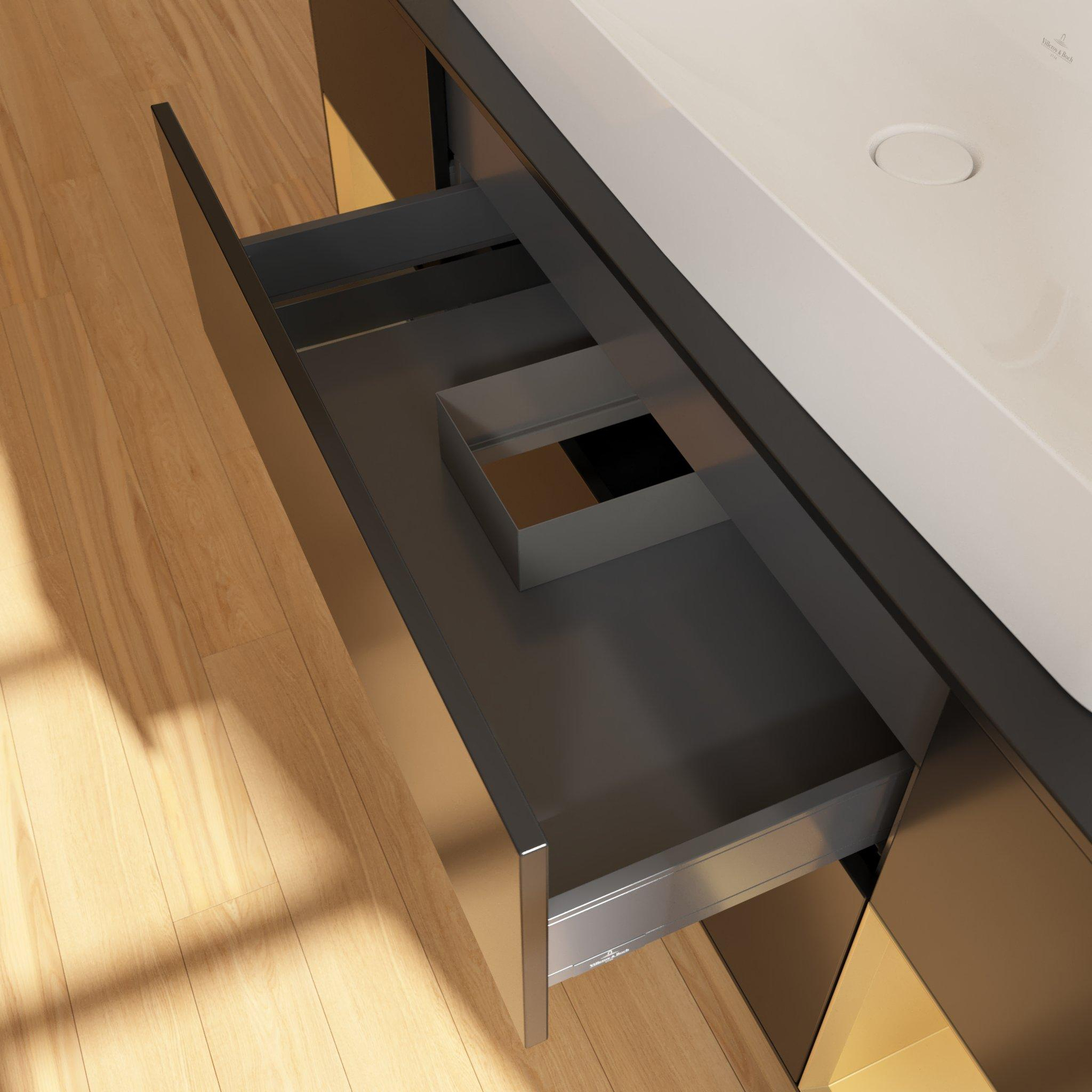 Avec pas moins de quatre tiroirs spacieux, vous disposez d’un emplacement dédié pour chaque membre de la famille ou pour chaque catégorie de produits. Les tiroirs sont à extraction totale, ce qui vous permet de bien voir tout ce qui se trouve au fond et d’éviter que quoi que ce soit ne disparaisse dans la profondeur. Grâce aux cloisons en verre amovibles et aux boîtes d’accessoires pratiques, vous aménagez l’intérieur des tiroirs entièrement selon vos souhaits : un tiroir pour les soins quotidiens, un pour le maquillage, un pour les serviettes et un autre pour les stocks. Les fonds antidérapants empêchent les flacons et les pots de glisser ou de se renverser, même si les tiroirs sont souvent ouverts et fermés. Ainsi, tout reste clair et bien ordonné, ce qui permet non seulement de gagner du temps le matin, mais contribue aussi à une sensation de rangement dans toute votre salle de bains.