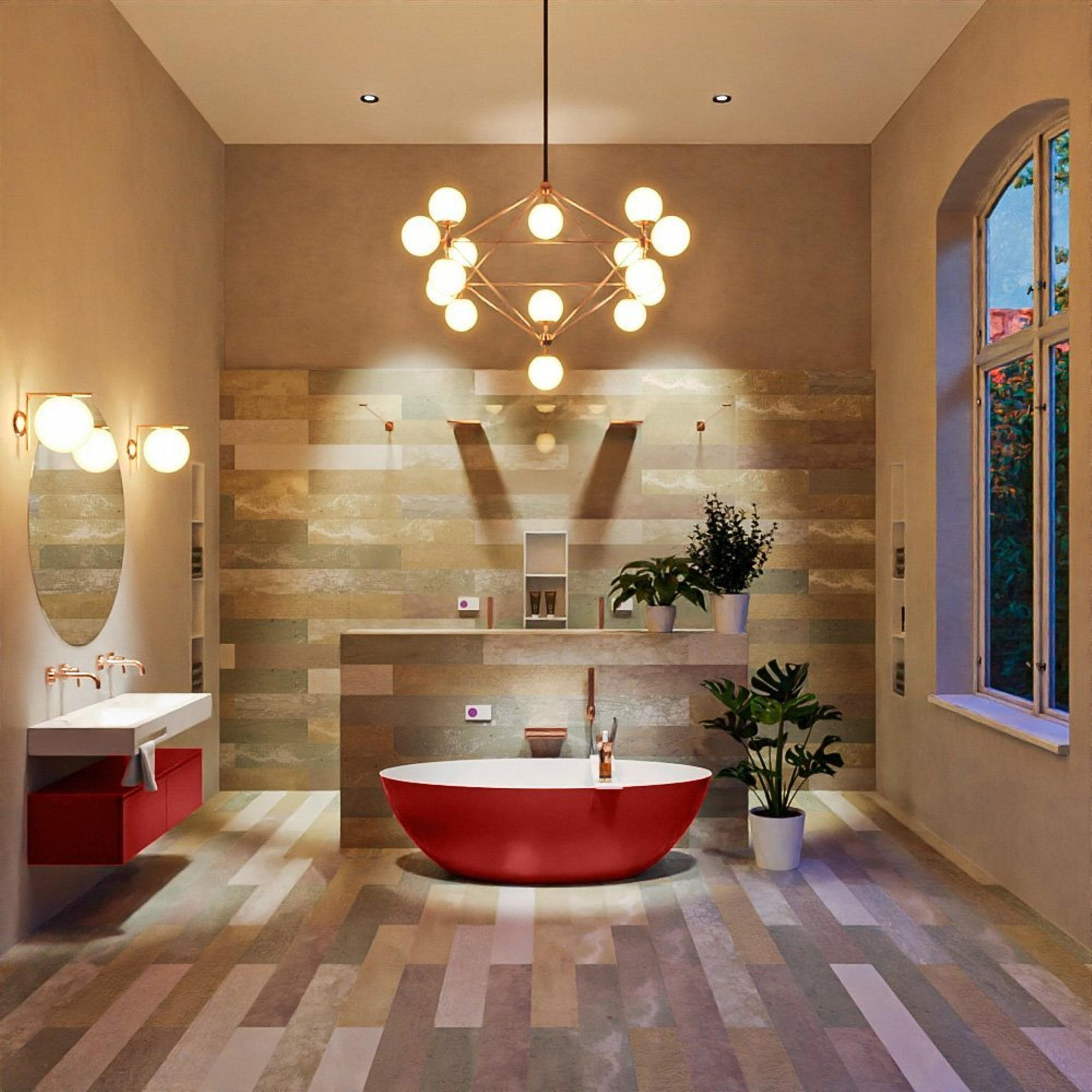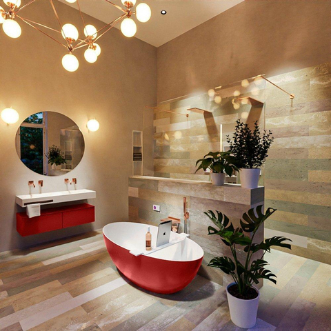 La forme ovale peut être placée librement, mais comme sur l'image, elle est également magnifique devant ou contre un mur. Cette magnifique configuration de salle de bain est combinée avec le meuble de salle de bain ALAN et des niches en Solid Surface. À la fois le lavabo et les meubles peuvent parfaitement s'accorder avec la baignoire. Vous pouvez choisir la couleur dans la salle de bain en toute tranquillité.