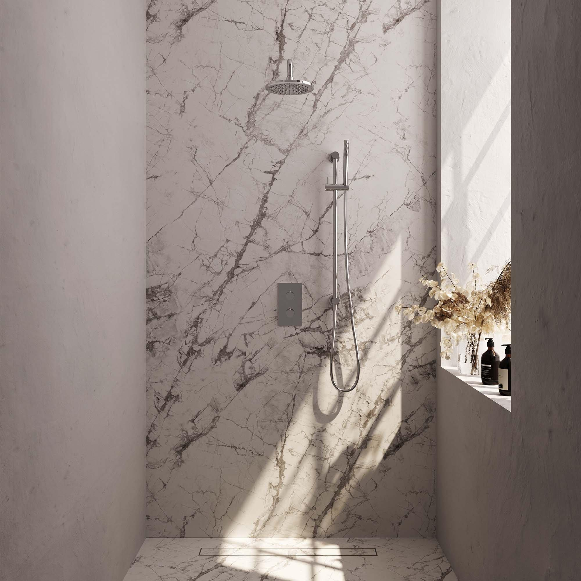 Avec cet ensemble complet de douche de tête encastrée, vous apportez une expérience de douche luxueuse digne d’un hôtel dans votre propre salle de bains. La combinaison d’une douche de tête spacieuse, d’une douchette barre pratique et d’une barre de douche épurée fait de ce set un choix malin pour ceux qui souhaitent combiner confort et design. Grâce au montage encastré, votre espace de douche reste dégagé et ordonné, tandis que la finition chromée brillante s’harmonise facilement avec les salles de bains aussi bien modernes qu’intemporelles. Cet ensemble est idéal si vous souhaitez améliorer votre douche actuelle en une douche de pluie confortable, mais aussi si vous concevez une nouvelle salle de bains et recherchez directement une solution complète et bien pensée. La commande thermostatique assure en outre une température de l’eau constante, ce qui est non seulement agréable mais aussi sûr pour toute la famille.