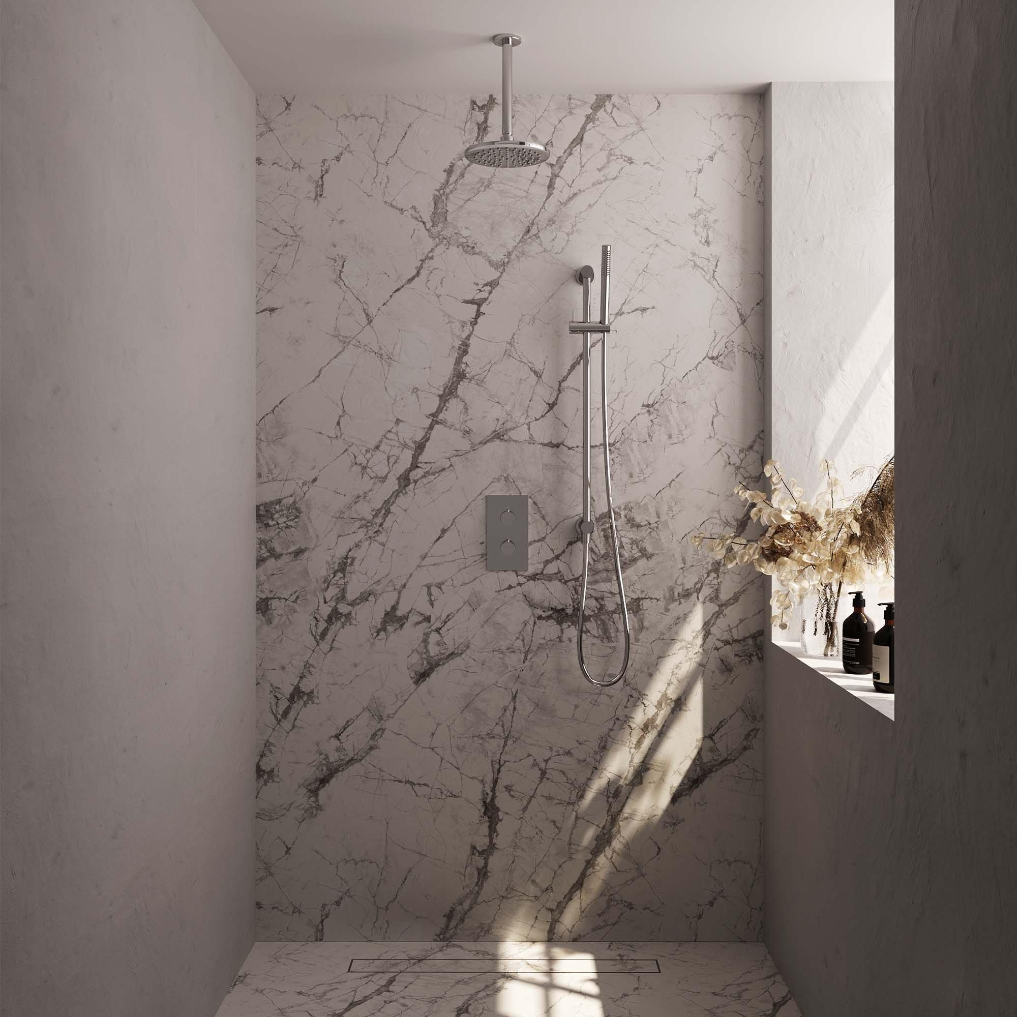 Ce set de douche de tête encastré complet est idéal si vous souhaitez transformer votre douche en une expérience luxueuse digne d’un hôtel, sans que l’ensemble paraisse trop chargé dans la salle de bains. Grâce à la finition épurée en chrome brillant, il s’intègre parfaitement dans les salles de bains modernes, mais aussi dans les intérieurs intemporels et neutres. Le système encastré crée un effet d’espace : vous ne voyez que les rosaces épurées, la douche de plafond, la barre de douche et la douchette élancée, tandis que la partie technique disparaît proprement dans le mur. Cela rend ce set particulièrement adapté aussi bien aux douches compactes qu’aux douches à l’italienne spacieuses. La combinaison d’une douche de pluie douce et d’une douchette pratique offre un grand confort au quotidien, mais aussi une aide précieuse pour rincer les cheveux ou nettoyer la douche. Si vous recherchez une solution durable, sûre et élégante avec laquelle vous êtes prêt en une seule fois, alors ce set complet est un choix judicieux.