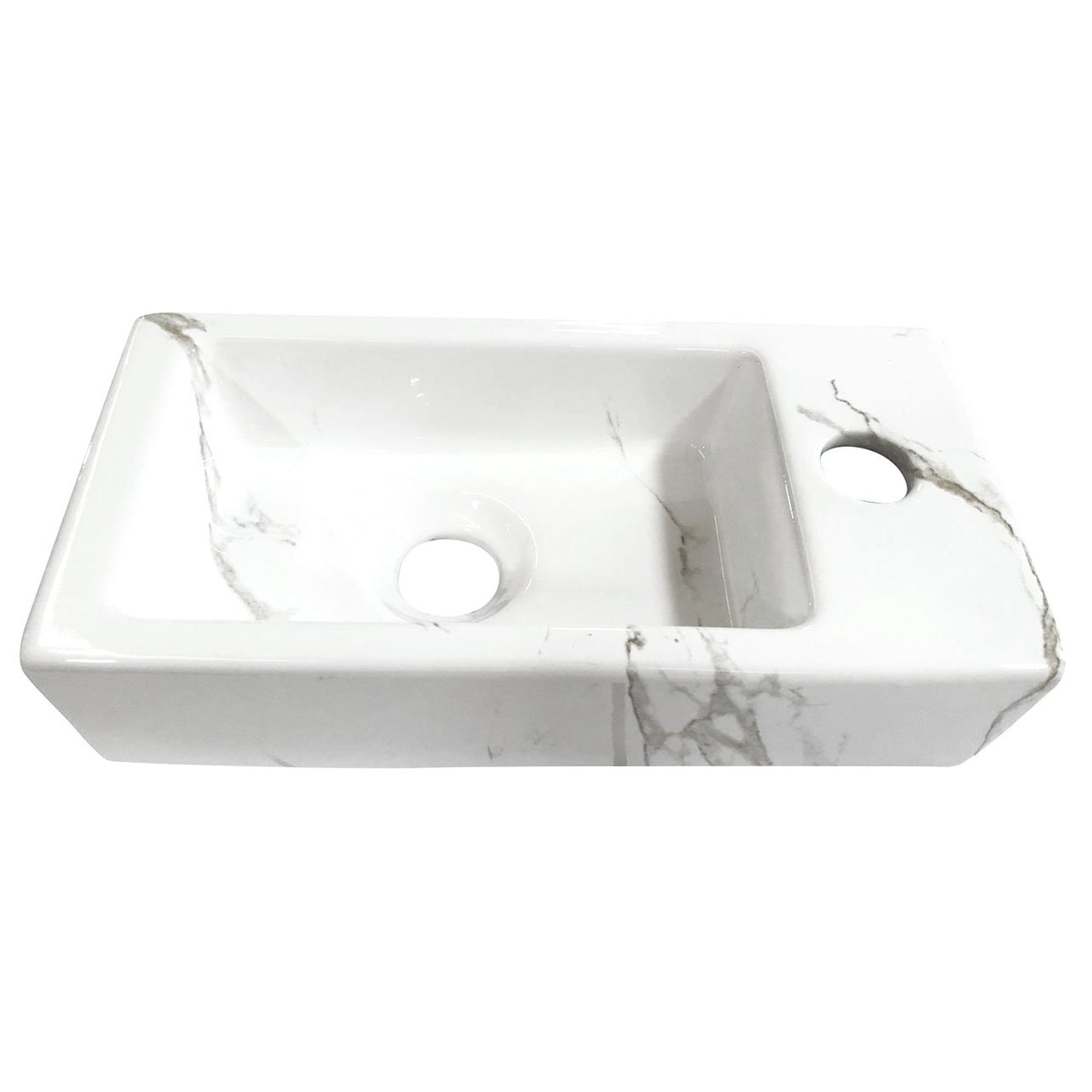 Le Wiesbaden One Pack Mini-Rhea droite lave-mains dégage de l'élégance dans son design simple et épuré. La finition en marbre Carrara ajoute une touche de luxe, tandis que les dimensions compactes garantissent qu'il s'intègre parfaitement dans les petites salles de bain ou toilettes. Ce lave-mains est une combinaison de fonctionnalité et d'esthétique, ce qui en fait un ajout intemporel à chaque salle de bain.