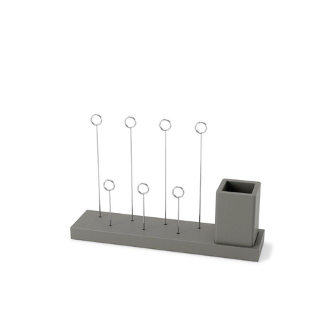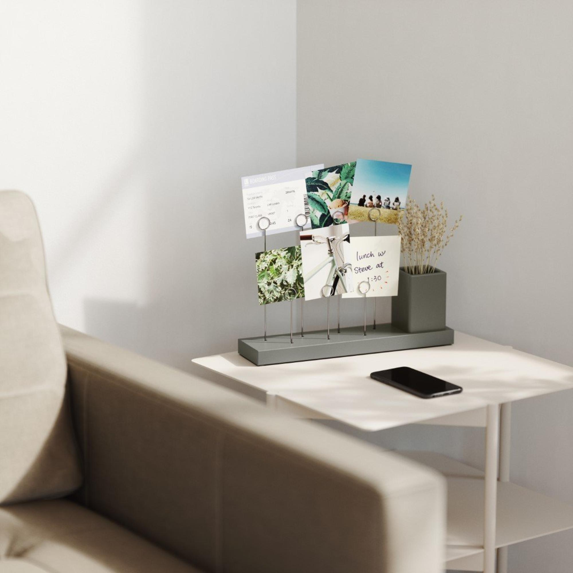 - UN SUPPORT PHOTO DYNAMIQUE Un support photo contemporain de format bureau ; il se compose de sept pinces à anneau sur une base lestée en noyer, sur laquelle se trouve également un bac en céramique amovible que vous pouvez utiliser comme petit pot de fleurs ou comme porte-stationery