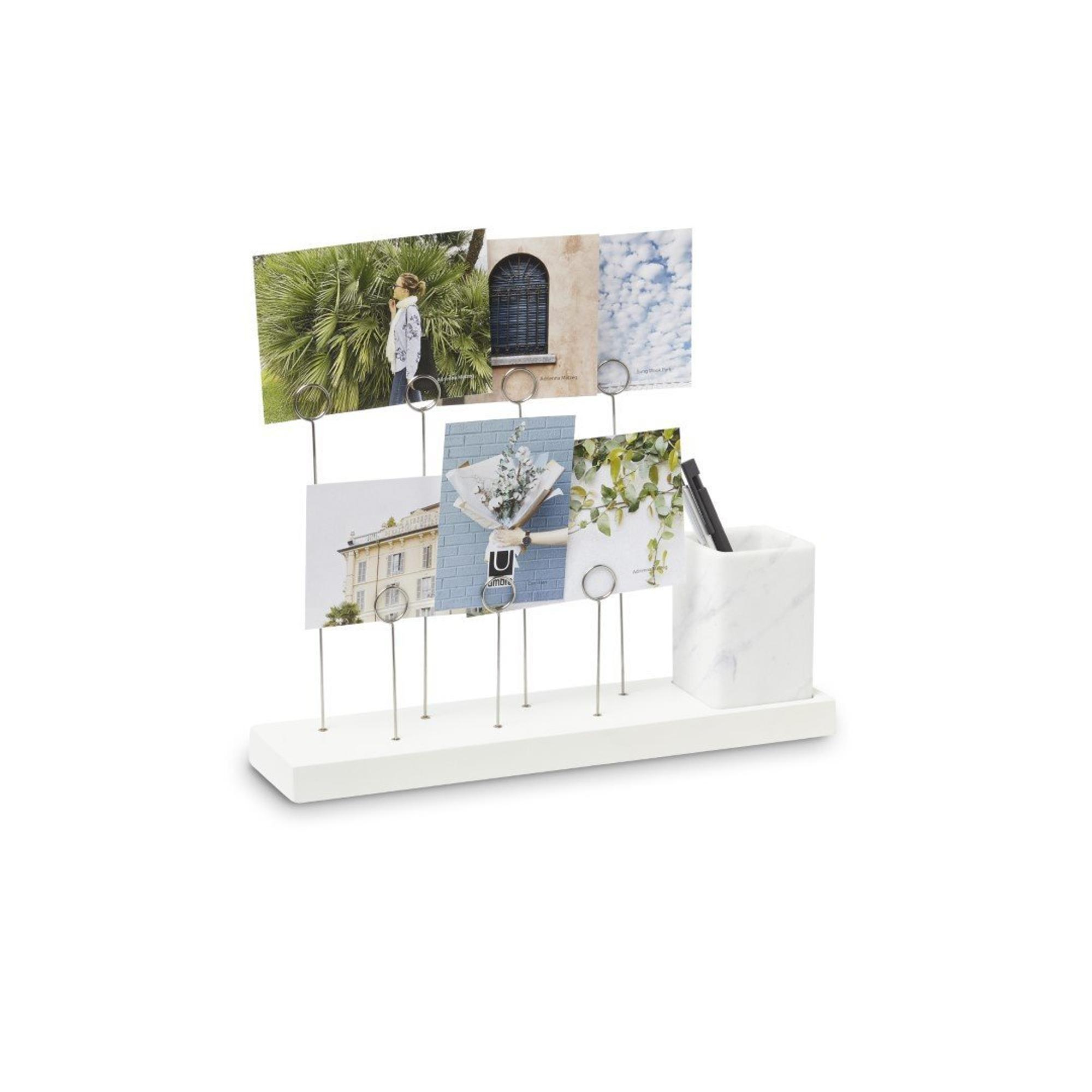 - UN SUPPORT PHOTO DYNAMIQUE Un support photo contemporain de format bureau ; il se compose de sept pinces à anneau sur une base lestée en noyer, sur laquelle se trouve également un bac en céramique amovible que vous pouvez utiliser comme petit pot de fleurs ou comme porte-stationery