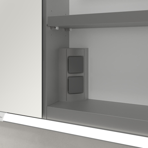 Derrière les trois portes miroir se cache un espace de rangement étonnamment généreux. Les étagères en aluminium réglables en hauteur se laissent facilement adapter à la hauteur de vos flacons, produits de soin et appareils, afin que tout reste bien ordonné et à portée de main. Le rebord relevé des étagères empêche les petits objets de tomber facilement ou de glisser hors de l’armoire, ce qui apporte un supplément de sérénité lors de l’utilisation de l’armoire. Deux prises de courant intégrées sont idéales pour recharger votre brosse à dents électrique, votre rasoir ou brancher un sèche-cheveux, de sorte que vous n’avez pas besoin de rallonges ou de prises supplémentaires à proximité du lavabo. Grâce au miroir grossissant, à la barre magnétique et au plateau fournis, vous créez rapidement un espace logiquement structuré pour, par exemple, une pince à épiler, un coupe-ongles ou du maquillage, afin que votre routine matinale se déroule encore plus facilement.