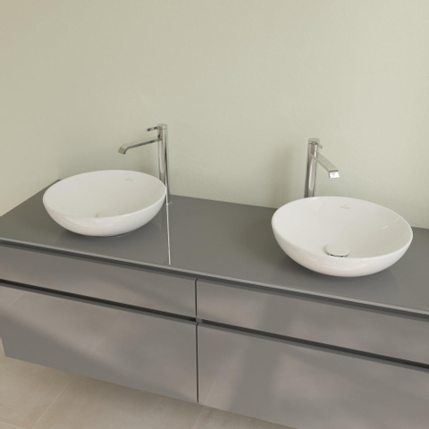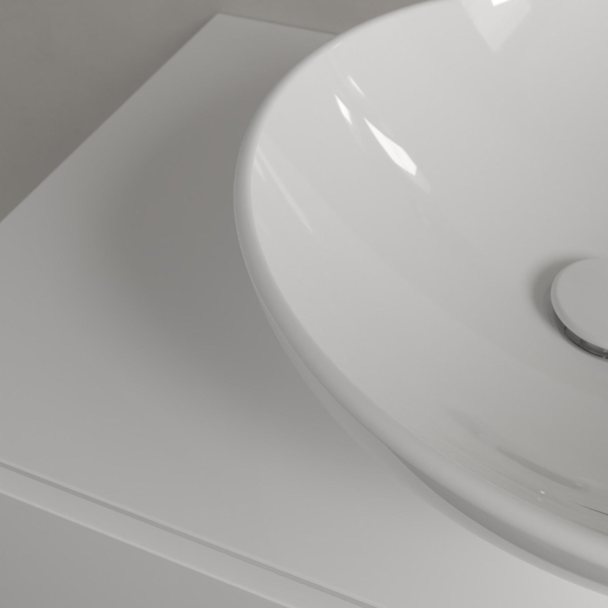 La cuve profonde permet de limiter au minimum les éclaboussures, ce qui vous évite d’essuyer le plan trop souvent et permet à l’espace de rester plus longtemps bien rangé. Grâce à cette profondeur, vous pouvez aussi facilement vous laver le visage ou les cheveux sans que l’eau ne s’écoule immédiatement par-dessus le bord. L’absence de trop-plein assure une apparence épurée et calme à l’intérieur de la vasque, sans détails interrompant les lignes. Si de l’eau arrive tout de même sur le bord ou sur le plan, vous pouvez l’essuyer d’un seul geste grâce à la forme ronde et aux surfaces lisses. Vous profitez ainsi chaque jour d’un grand confort, sans faire de concessions sur le style.