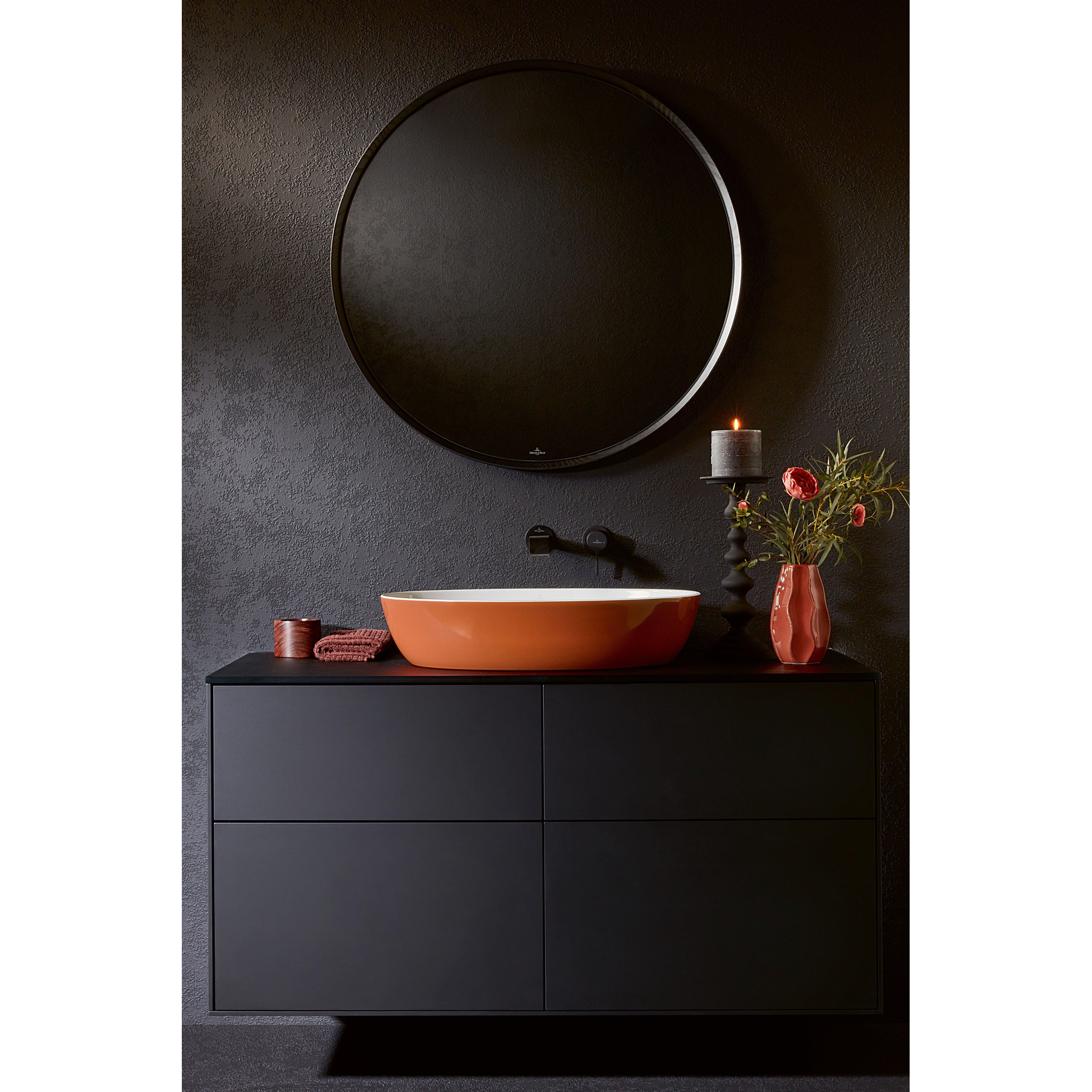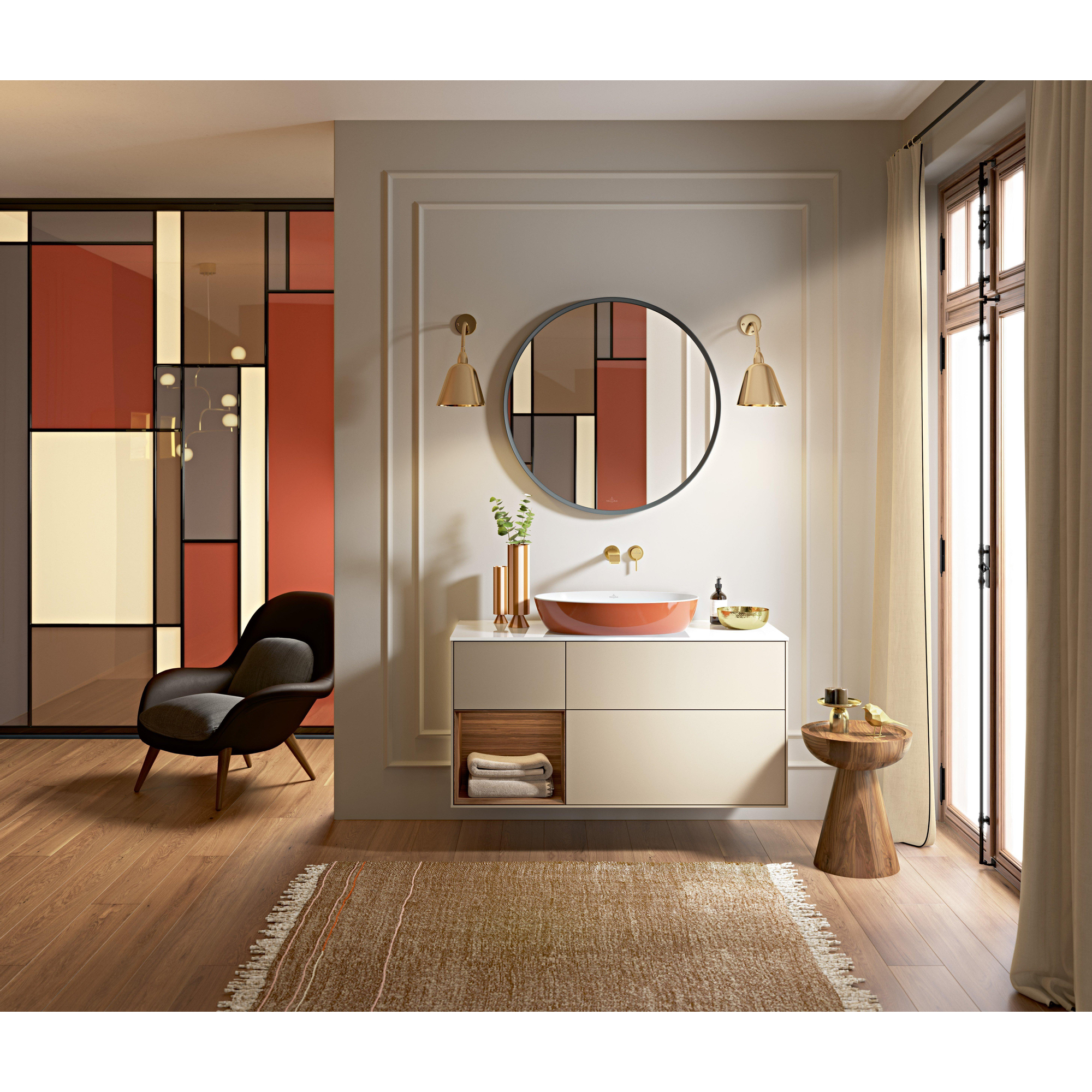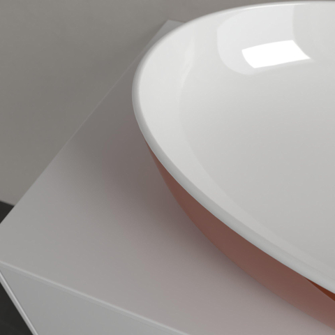 La version BiColour crée un contraste captivant : à l’extérieur, vous voyez la teinte chaude couleur rouille qui dégage immédiatement une impression de chaleur et de design, tandis que l’intérieur reste blanc classique pour un look frais et intemporel. Cela permet de combiner facilement le lavabo avec des meubles de salle de bains calmes et neutres, mais aussi avec des matériaux marqués comme le bois ou la pierre naturelle. La forme ovale a une apparence douce et organique, ce qui permet de mettre magnifiquement en scène le lavabo dans des salles de bains modernes, scandinaves ou d’inspiration hôtel de luxe. Si vous souhaitez un véritable accroche-regard sur votre plan de toilette sans que l’ensemble paraisse chargé, ce look BiColour est un choix astucieux et élégant.
