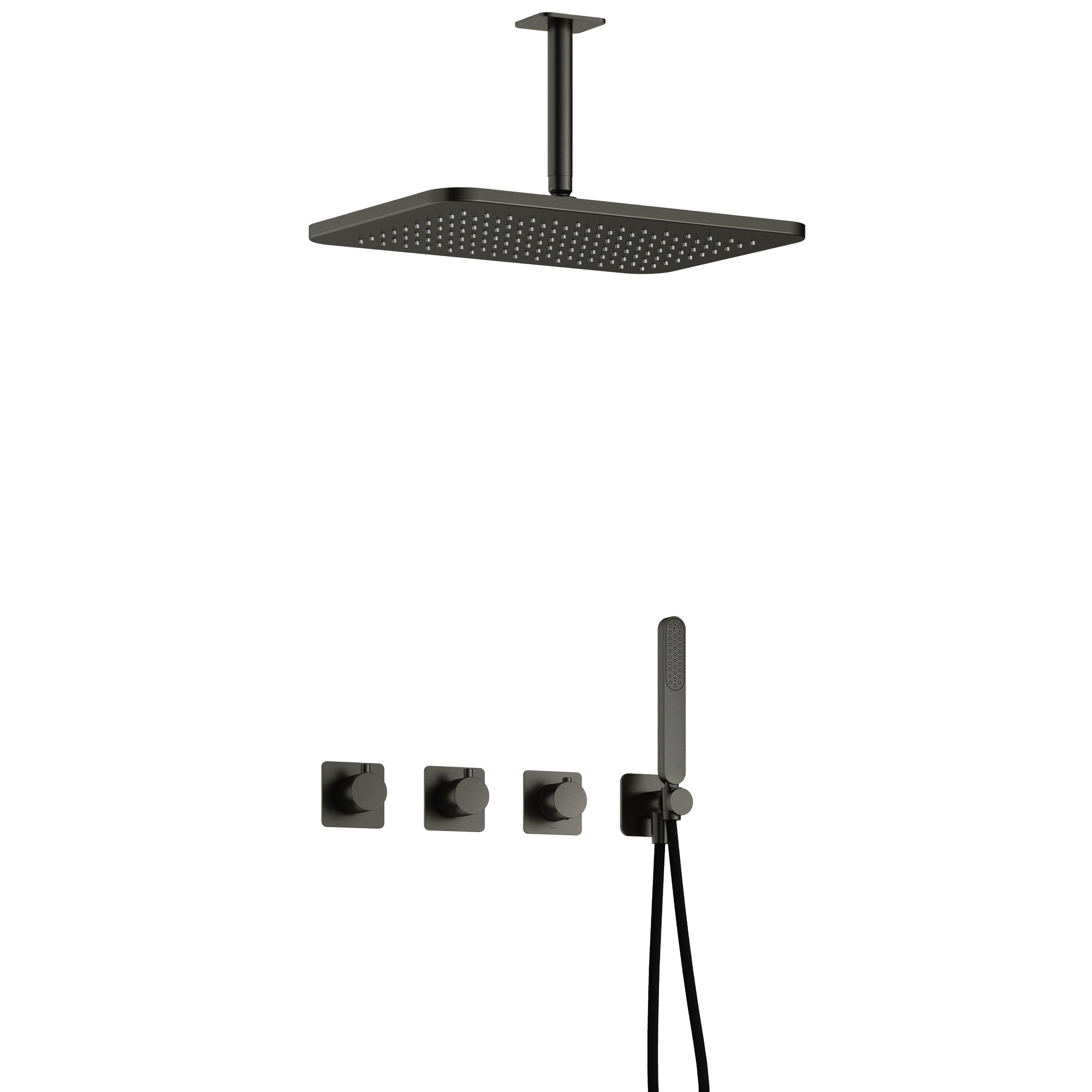 Hotbath Gal IBSGL70 Ensemble de douche thermostatique encastré - 2 robinets d'arrêt - bras de plafond 15 cm - douche de tête rectangulaire 27 cm - douchette stick - gun metal brossé PVD