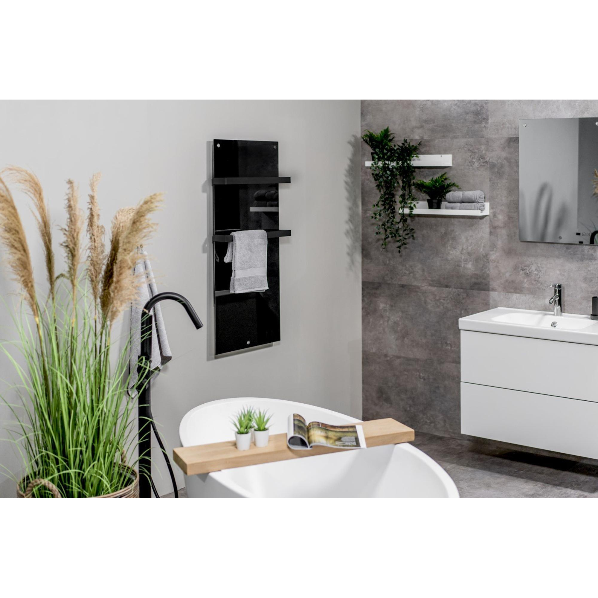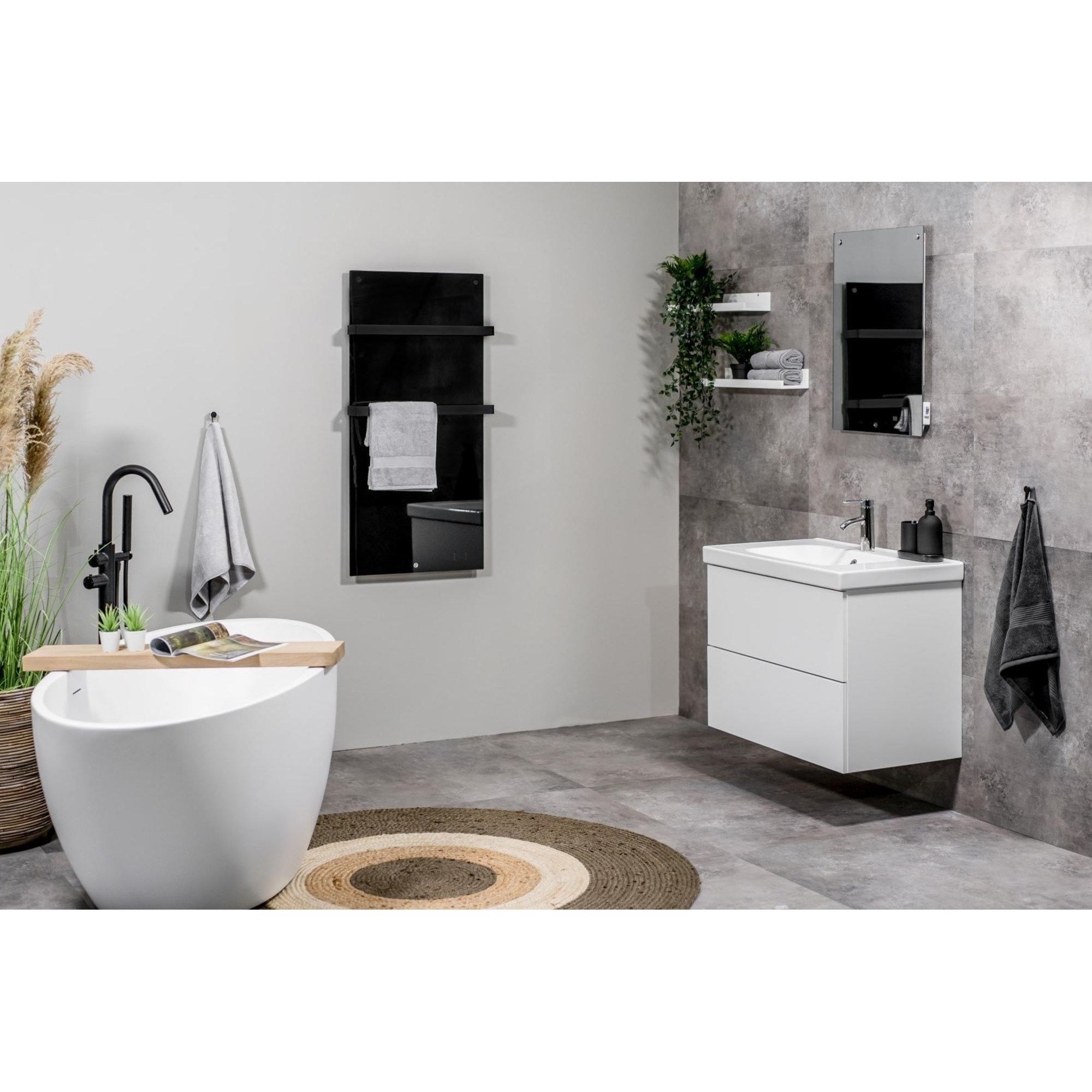 Vous cherchez un chauffage de salle de bains fin et moderne qui procure rapidement une chaleur agréable, sans un radiateur encombrant en vue ? Alors ce panneau infrarouge est un choix judicieux. Grâce à sa forme verticale, il s’intègre parfaitement à côté de la douche ou du lavabo, même dans une salle de bains plutôt étroite ou de taille moyenne. La combinaison de verre et de noir brillant en fait un véritable accroche-regard dans les intérieurs modernes, mais il s’harmonise également très bien avec un style campagne épuré ou industriel. Grâce à la chaleur rayonnante ciblée, la salle de bains devient rapidement confortable, précisément aux moments où vous y êtes. Avec la commande intégrée et la connectivité wifi, vous adaptez facilement l’utilisation à votre rythme quotidien, afin de profiter d’une douche bien chaude sans gaspiller inutilement de l’énergie.