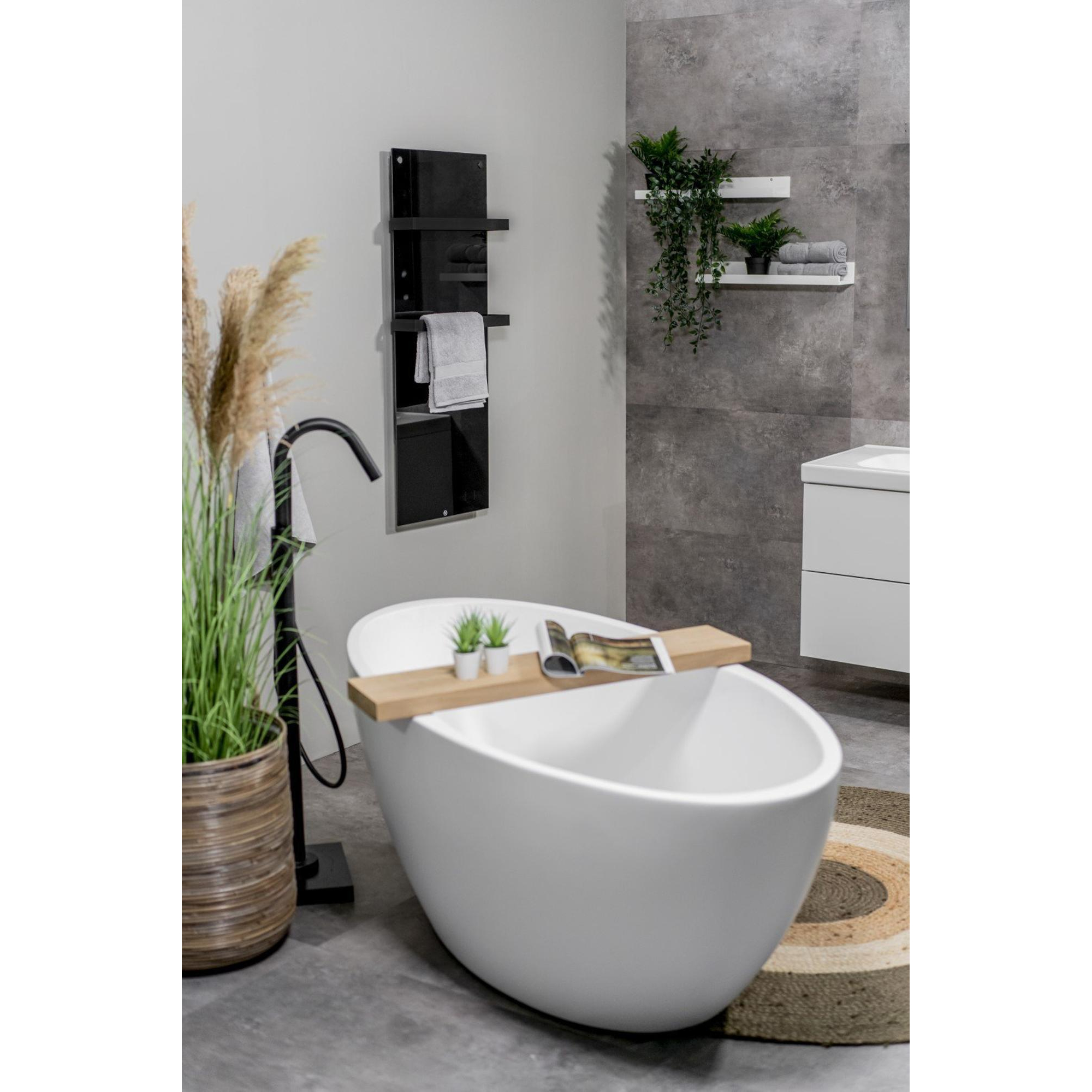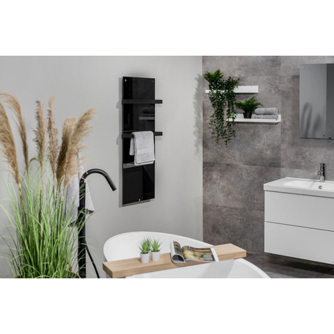 La plaque de verre noire haute brillance donne immédiatement à votre salle de bains un aspect luxueux et moderne. Comme le panneau ne fait que 5 cm de profondeur et se monte verticalement au mur, il a un aspect minimaliste et prend à peine de place. La surface lisse, sans ailettes ni tuyaux, crée un look épuré, ce qui lui permet de bien se combiner aussi bien avec des carreaux sombres qu’avec des tons clairs et naturels. Le panneau peut en outre servir d’endroit élégant pour suspendre des serviettes à proximité de la source de chaleur, ce qui n’est pas seulement pratique, mais renforce également cette sensation de bien-être dans votre propre salle de bains. Vous ajoutez ainsi avec un seul produit à la fois du confort et du design à votre intérieur.