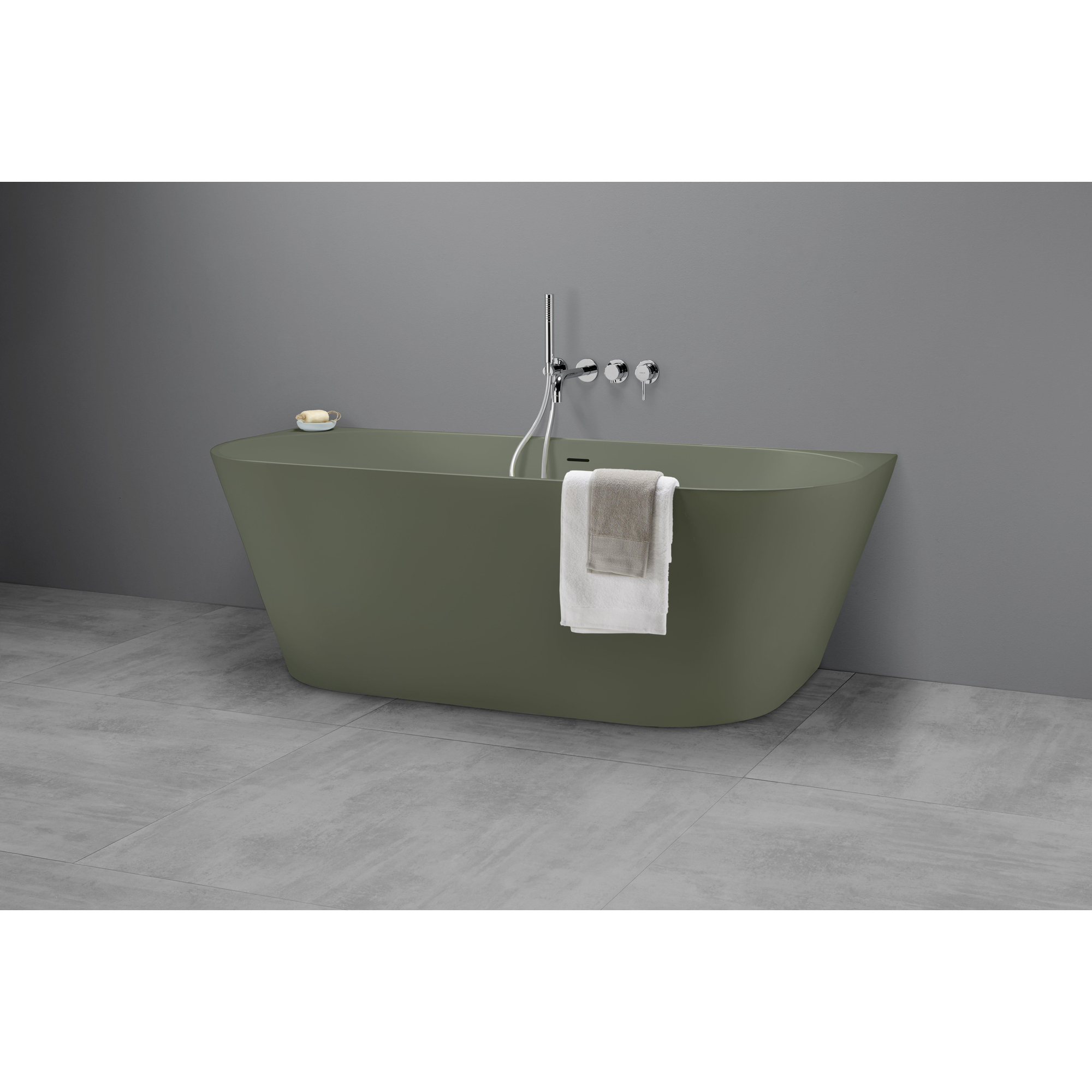 La finition verte mate donne immédiatement du caractère à votre salle de bains et se distingue des baignoires blanches standard. Cette teinte douce et légèrement grisée se marie à merveille avec des carreaux clairs, des tons de bois naturels et des robinets noirs ou couleur laiton, conférant à votre salle de bains une allure haut de gamme, presque digne d’un hôtel. Comme l’extérieur est entièrement fini tout autour, la baignoire présente, sur les côtés visibles, un aspect net et sans raccords, ce qui apaise visuellement l’espace. La surface mate capte la lumière de manière subtile, sans reflets gênants, ce qui rend la couleur encore plus chaleureuse et luxueuse. Que vous visiez un style de salle de bains minimaliste, scandinave ou botanique, cette baignoire forme un point central élégant autour duquel vous pouvez concevoir le reste.