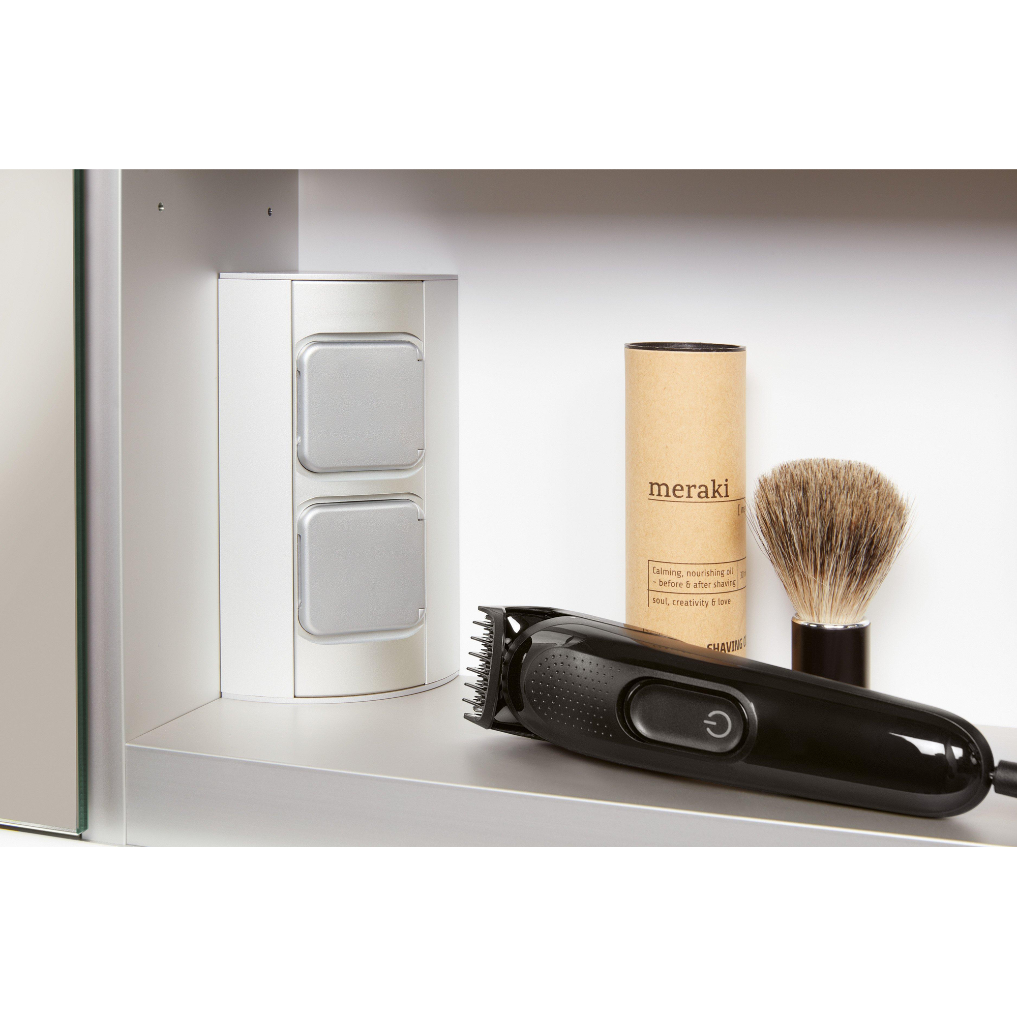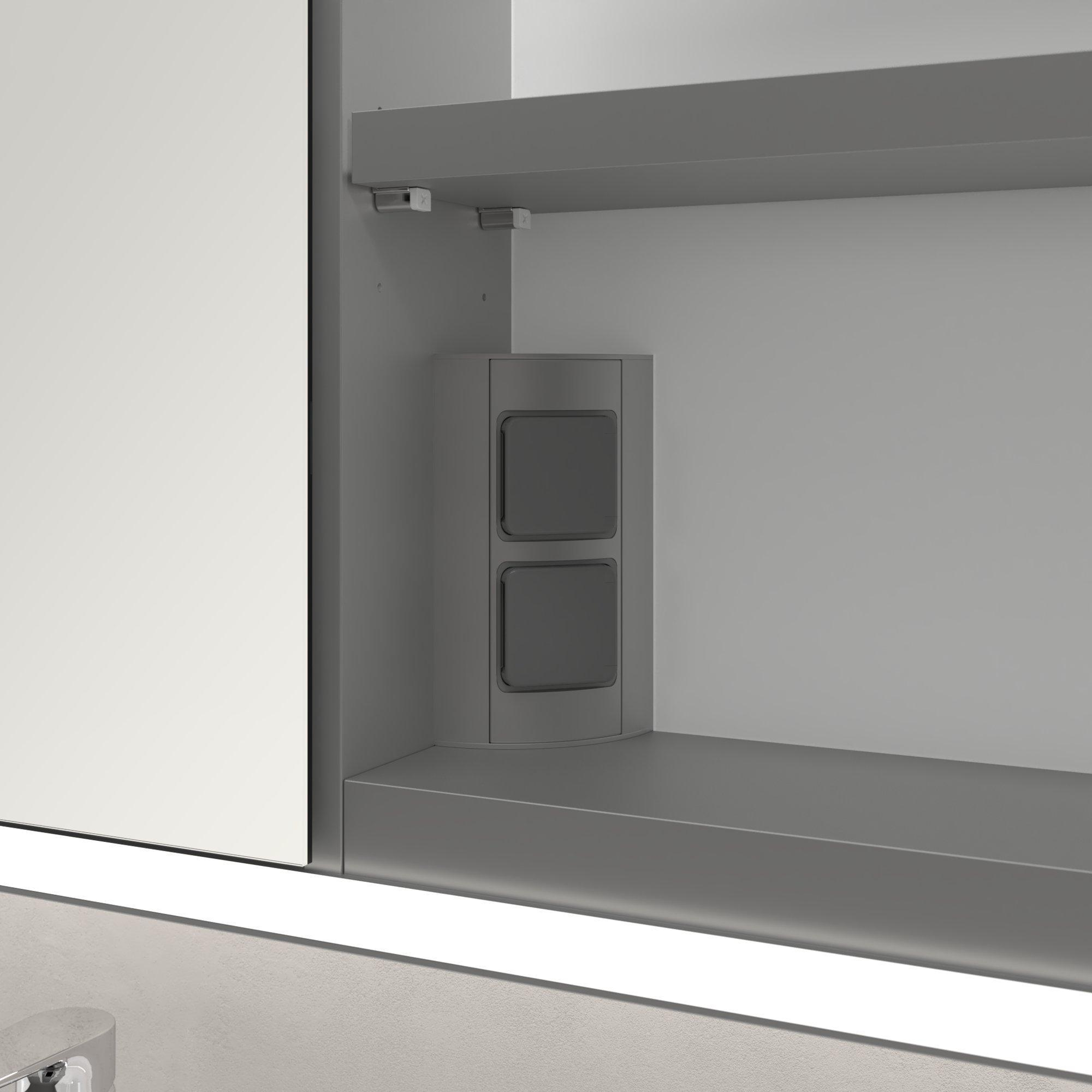 Derrière les trois portes miroir à double face se trouve un intérieur spacieux spécialement conçu pour garder votre salle de bains bien rangée. Les étagères en aluminium réglables en hauteur facilitent l’aménagement de votre armoire selon vos souhaits : des grands flacons et brosses à dents électriques aux petits pots et maquillage. Grâce aux bords relevés, vos affaires restent bien en place et vous réduisez le risque qu’un objet ne tombe accidentellement. Les prises de courant intégrées à l’intérieur sont idéales pour recharger les rasoirs ou les brosses à dents électriques, tandis que la prise externe offre un confort supplémentaire pour, par exemple, un sèche-cheveux ou un lisseur. Avec le miroir grossissant fourni, la barre magnétique pratique et la tablette de rangement, vous gardez les objets utilisés quotidiennement bien organisés et à portée de main.