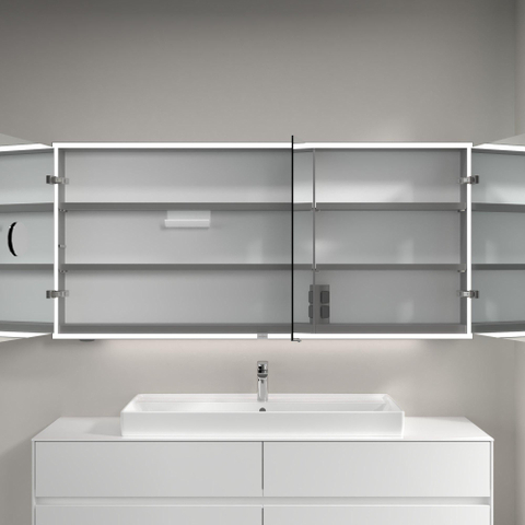 Cette armoire de toilette spacieuse est idéale si vous avez une large configuration de lavabo et que vous recherchez une solution épurée et moderne avec beaucoup d’espace de rangement et une lumière parfaite. Grâce à l’éclairage LED intégré tout autour de la surface du miroir et au-dessus du lavabo, vous bénéficiez toujours d’une visibilité optimale pour les routines quotidiennes comme le rasage, l’application du maquillage ou la mise en place de lentilles. L’armoire s’intègre à merveille dans une salle de bains familiale moderne ou luxueuse, mais trouve tout autant sa place dans une suite parentale élégante ou une salle de bains design. Avec les solutions de rangement intelligentes, les prises intégrées et les éléments pratiques tels qu’un miroir grossissant et une barre magnétique, vous optez non seulement pour un bel élément phare, mais aussi pour un confort et une facilité d’utilisation au quotidien.
