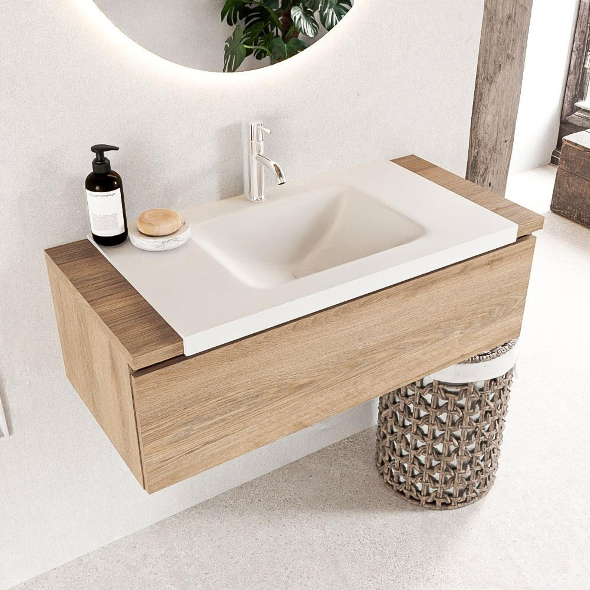 Mondiaz BUKLA Ensemble de meuble - 100x45x34cm - 1 trou de robinet - lavabo au centre - solid surface - Talc - sans poignée - 1 tiroir - Mélamine - Chêne blanchi
