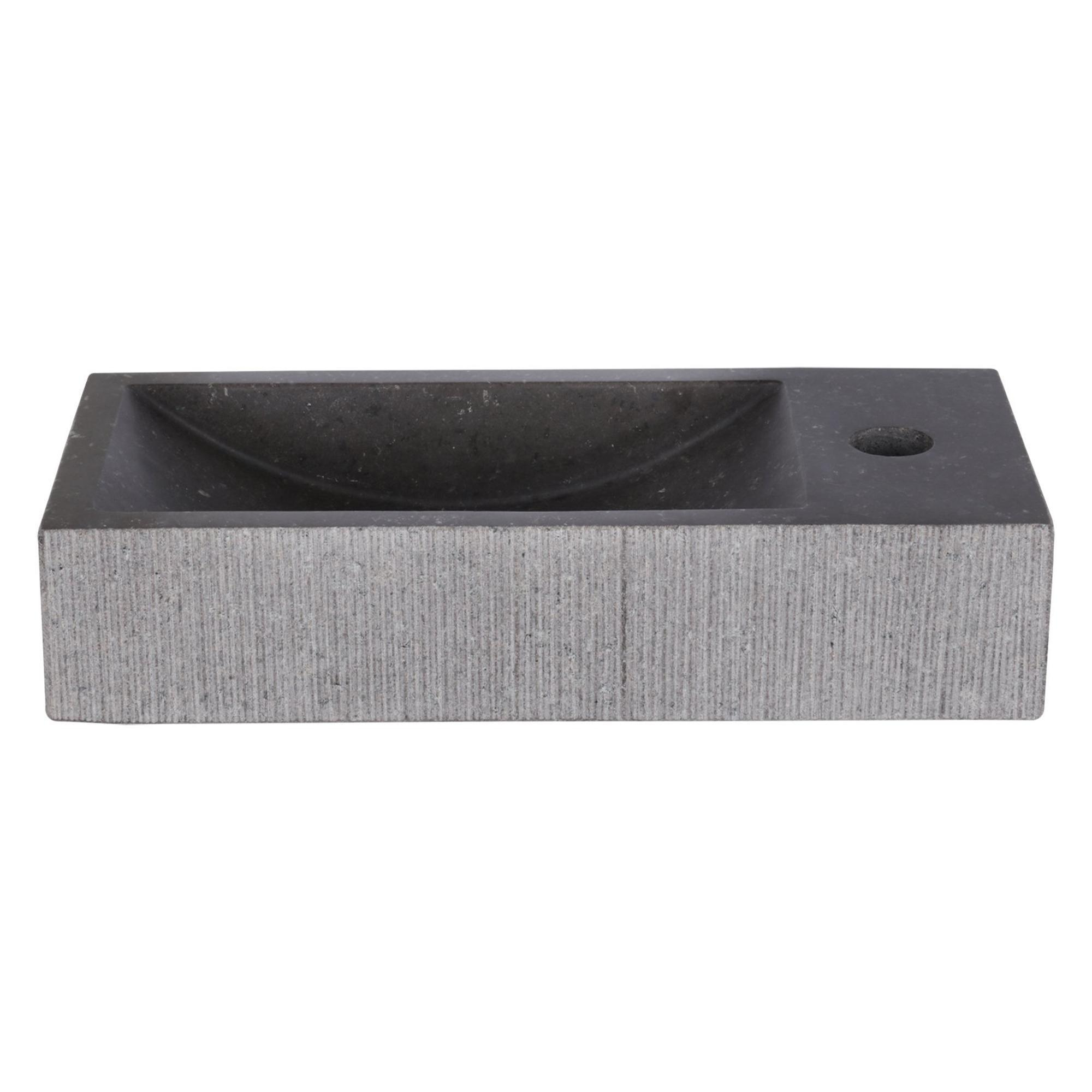 Ce petit lave-mains compact est idéal si vous souhaitez tirer le maximum d’un petit espace de toilettes sans faire de concessions sur l’apparence. Le design fin et rectangulaire prend peu de place, mais offre tout de même suffisamment d’espace pour vous laver les mains confortablement. Grâce à la pierre naturelle profonde et sombre, vos toilettes prennent immédiatement une atmosphère luxueuse et digne d’un hôtel, même si la pièce est petite ou reçoit peu de lumière du jour. La position du robinet sur la droite rend ce modèle particulièrement adapté aux toilettes étroites ou aux situations où vous disposez de peu d’espace de mouvement à l’entrée. Si vous recherchez une solution intemporelle, robuste et facile d’entretien, qui se combine sans effort avec des accessoires noirs, en bois ou blancs, alors ce meuble lave-mains en pierre naturelle est un choix très judicieux pour vos toilettes ou un coin de petite salle de bains.Format compact, grand effet dans les petits espaces