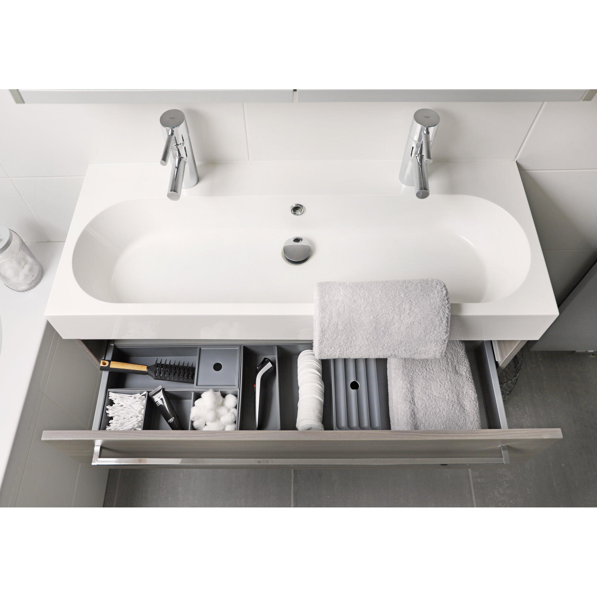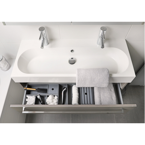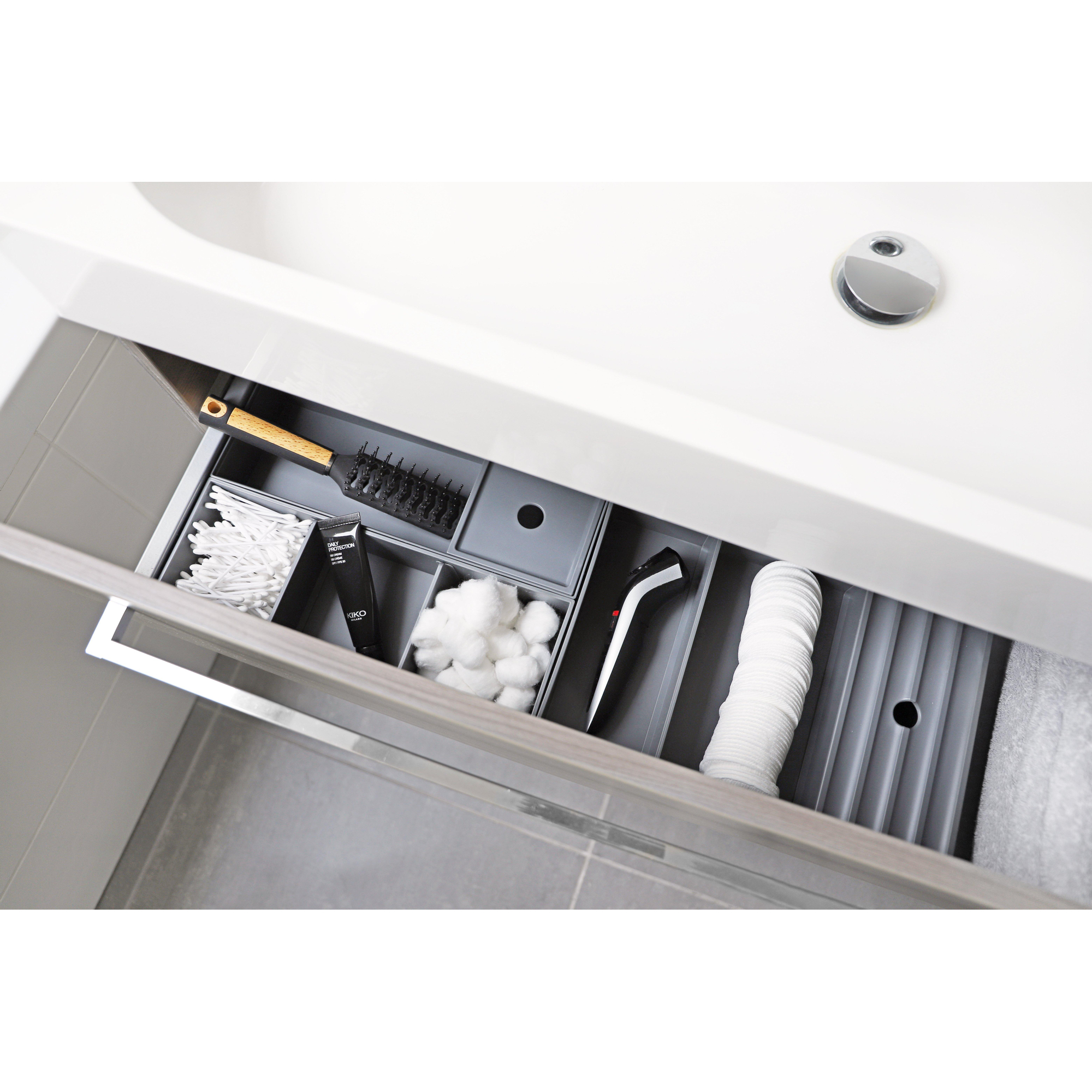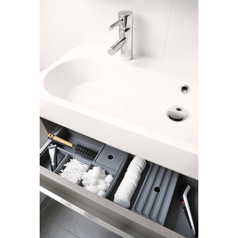 L'organiseur est divisé en trois compartiments pratiques, afin que vous puissiez regrouper logiquement les petits accessoires de salle de bains. Pensez à mettre ensemble les rasoirs et coupe-ongles, les accessoires pour cheveux dans un autre compartiment et le maquillage ou les produits de soin dans le troisième compartiment. Grâce à cette structure, vous perdez moins rapidement vos affaires et vous gagnez du temps au quotidien. La division fixe des compartiments maintient tout bien en place, même si le tiroir est ouvert et fermé régulièrement. Ainsi, votre meuble de salle de bains ne semble pas seulement rangé, mais il paraît également immédiatement plus apaisant à l'utilisation.