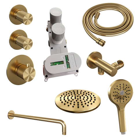 Ensemble de douche pluie Brauer Gold Carving encastré - douche principale 20cm - bras mural - avec partie encastrable - boutons Carving - douchette ronde 1 fonction - PVD - or brossé