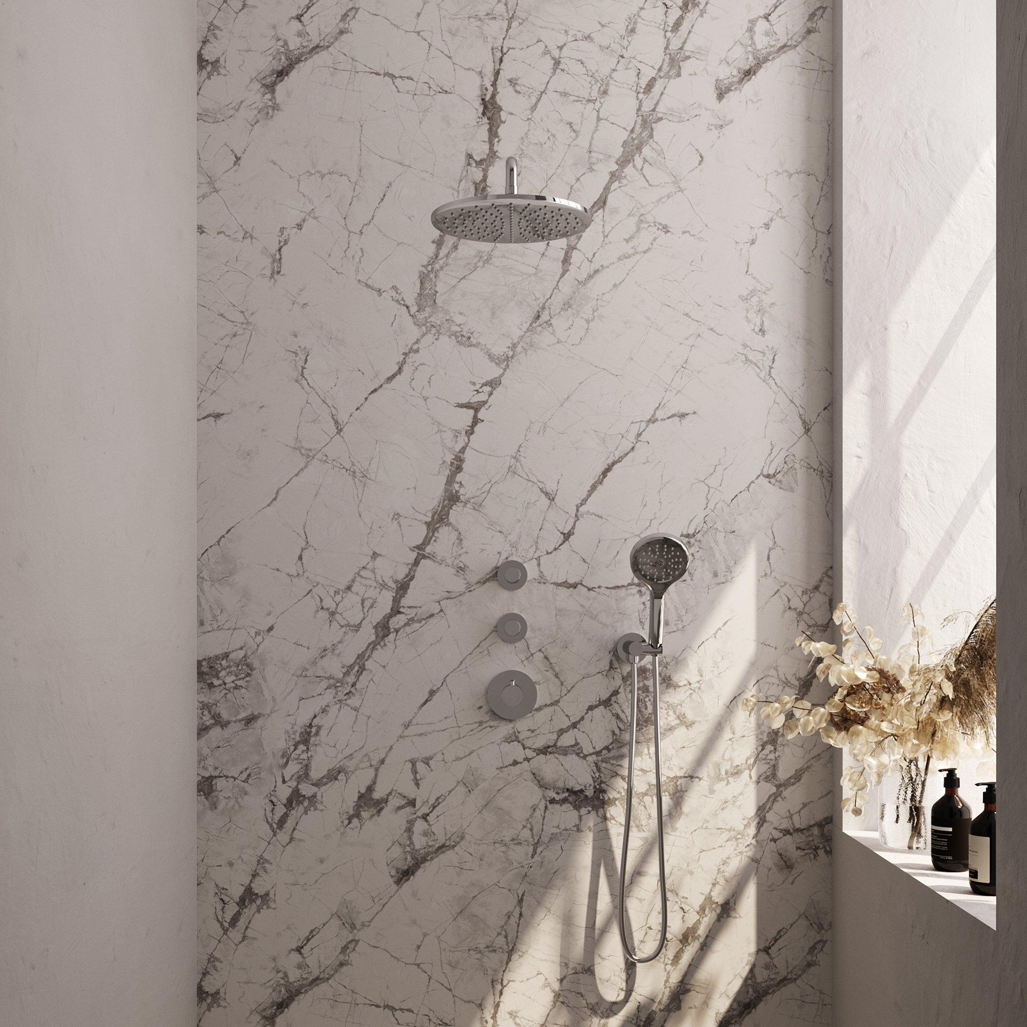 Cet ensemble de douche pluie encastré combine fonctionnalité et style. Avec un design épuré et des matériaux de haute qualité, ce système de douche est non seulement pratique, mais aussi un ajout stylé à votre salle de bain. La douche principale ronde de 30cm assure une distribution uniforme de l'eau, tandis que la finition chrome donne une apparence intemporelle à l'espace.