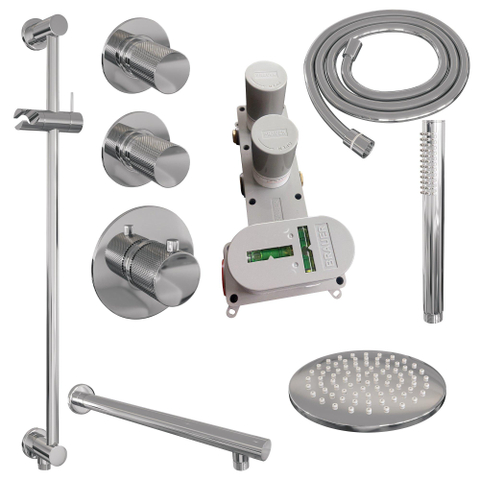 Brauer Chrome Carving Ensemble de douche à pluie encastré - douche principale 20cm - 3 boutons sculptés - bras mural droit - glissière - douchette à main 1 fonction - chrome