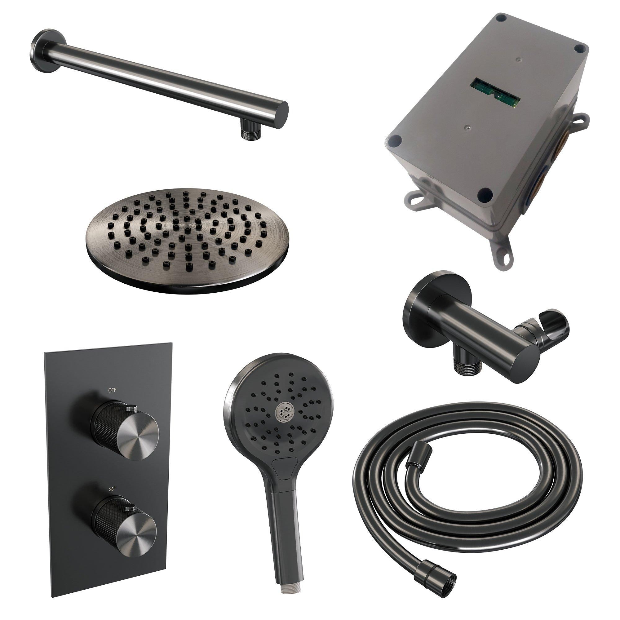 Brauer Gunmetal Carving Ensemble de douche à pluie encastré - douche principale 20cm - bouton carving - douchette ronde 3 fonctions - PVD - gunmetal brossé