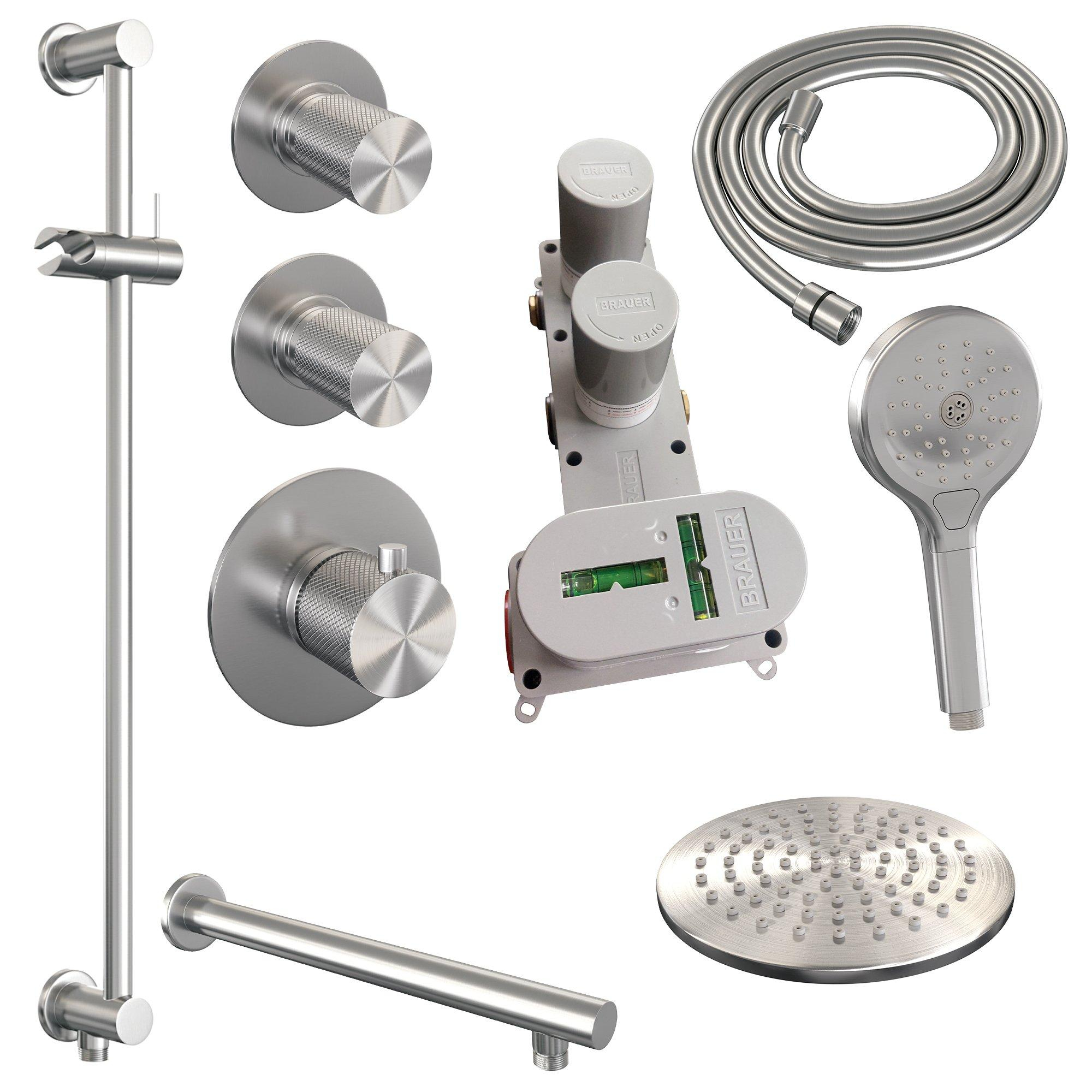 Brauer Douche pluie encastrable brossé - douche principale 20cm - 3 boutons sculptés - bras mural droit - glissière - douchette ronde 3 positions - PVD - inox brossé