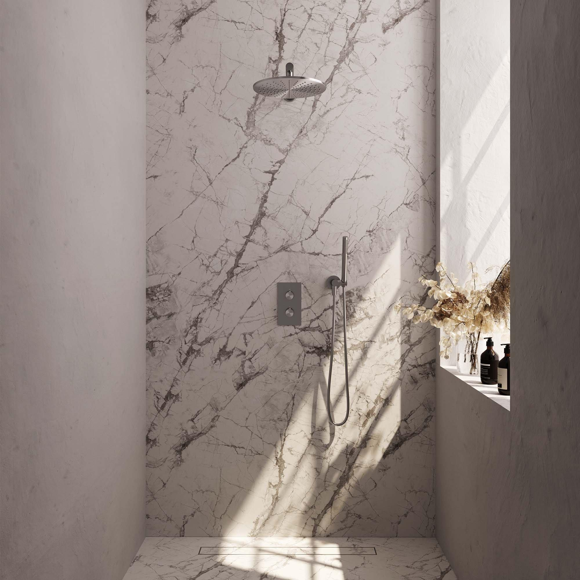 Diamètre pommeau : 20 cm -30cm Bras plafond - douchette 3 jet(s) Rond - Inox brossé PVD - Bouton Carving (€ 1.318,30 )