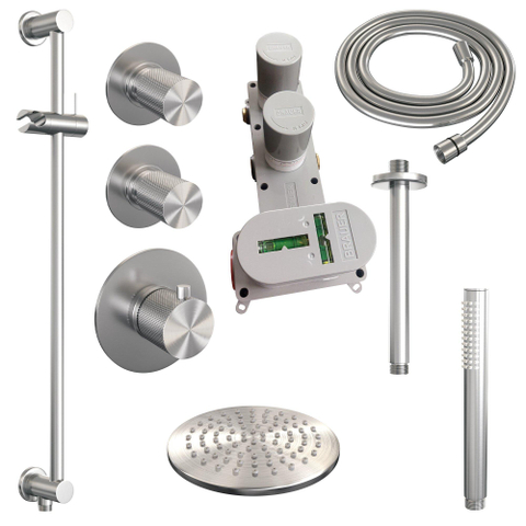 Brauer Brushed Carving Ensemble de douche pluie encastré - douche principale 20cm - bras plafond 20cm - 3 boutons sculptés - douchette à main barre 1 fonction - - PVD - inox brossé