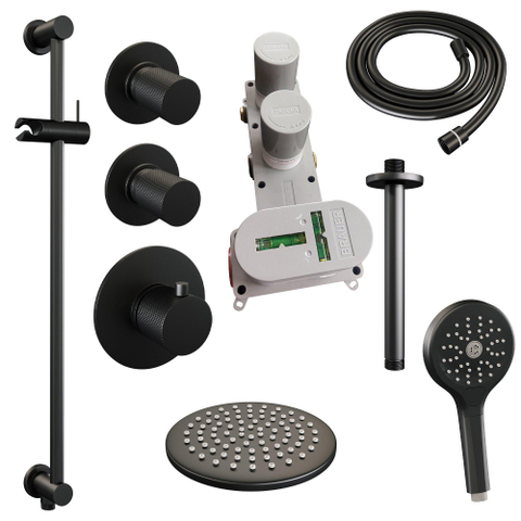 Ensemble de douche pluie encastré Brauer Black Carving - douche principale 20 cm - bras plafond - 3 boutons avec relief - douchette ronde 1 fonction - noir mat
