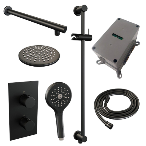 Ensemble de douche pluie Brauer Black Carving encastré - douche principale 20 cm - bras mural droit - glijstang - avec partie encastrable - 2 fonctions - bouton carving - douchette ronde 1 fonction - noir mat