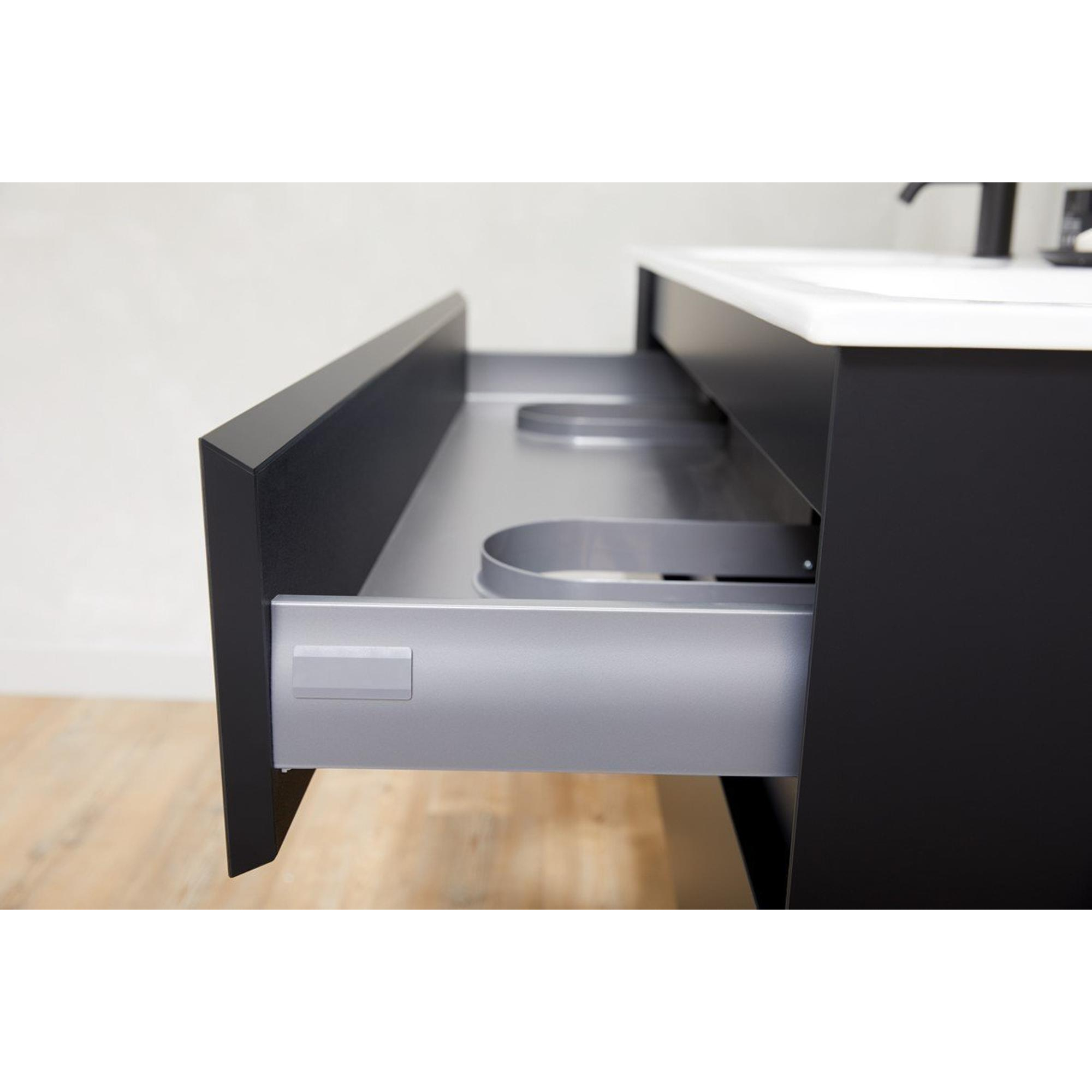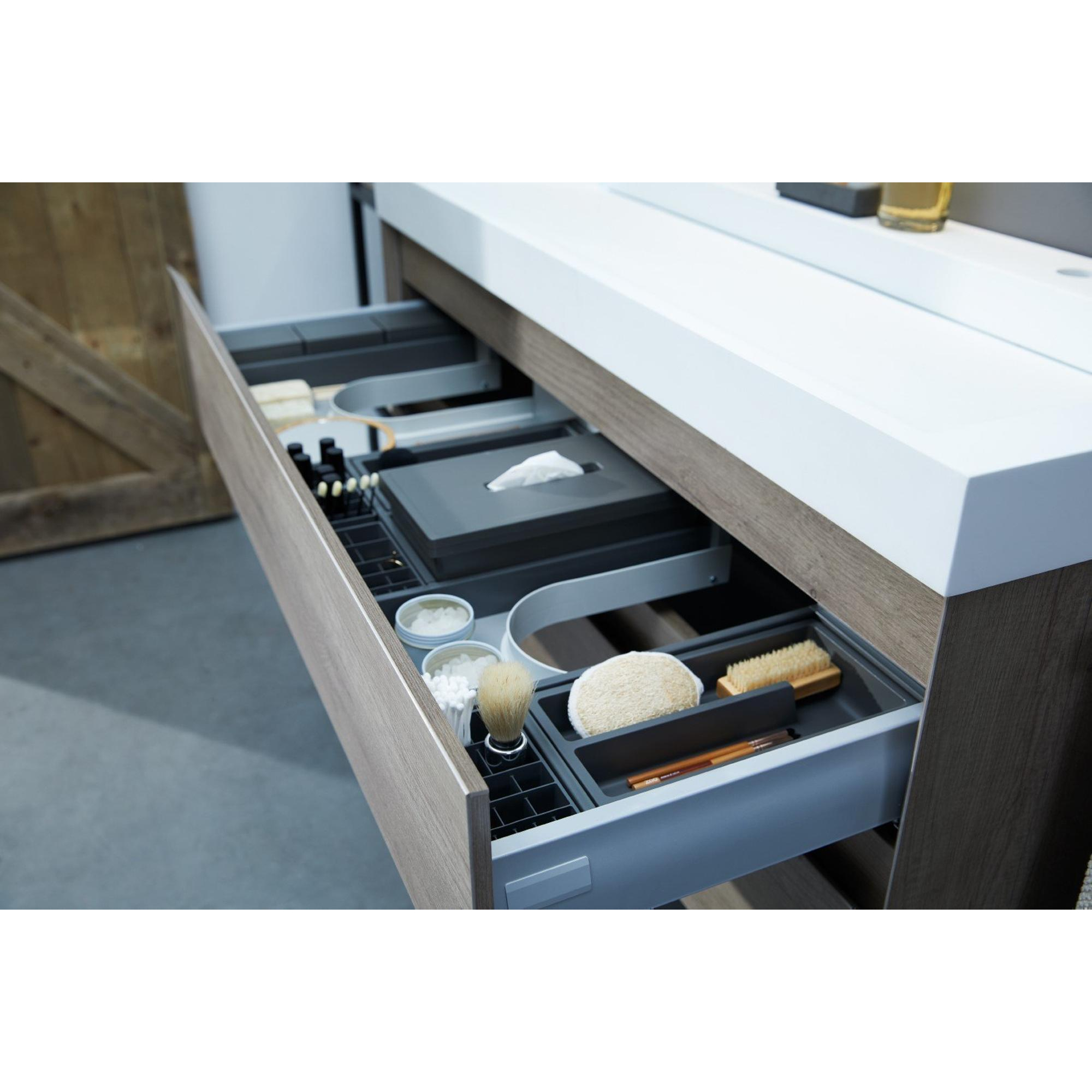 À l’usage quotidien, vous remarquerez immédiatement le confort des deux grands tiroirs softclose. Ils se ferment silencieusement et de manière contrôlée, même lorsqu’ils sont plus lourdement chargés en serviettes ou bouteilles. Cela donne non seulement une sensation de luxe, mais c’est aussi plus pratique et plus sûr dans une salle de bains très fréquentée. L’agencement sur toute la largeur de 120 cm vous offre largement assez de place pour ranger vos affaires de manière ordonnée : du maquillage et des articles de rasage aux sèche-cheveux et produits de soin pour toute la famille. Comme chaque chose trouve sa place fixe dans les tiroirs, votre plan de lavabo reste dégagé et la salle de bains paraît automatiquement ordonnée.