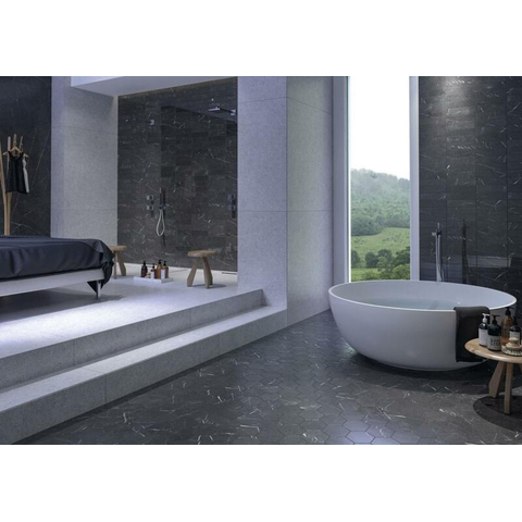 Ce carrelage respire le style et la classe avec son aspect marbre en noir mat. Le design intemporel s'adapte parfaitement aux intérieurs à la fois minimalistes et opulents. La couleur noire profonde et les motifs de marbre subtils confèrent une sensation de luxe et de raffinement à chaque espace où ils sont posés.