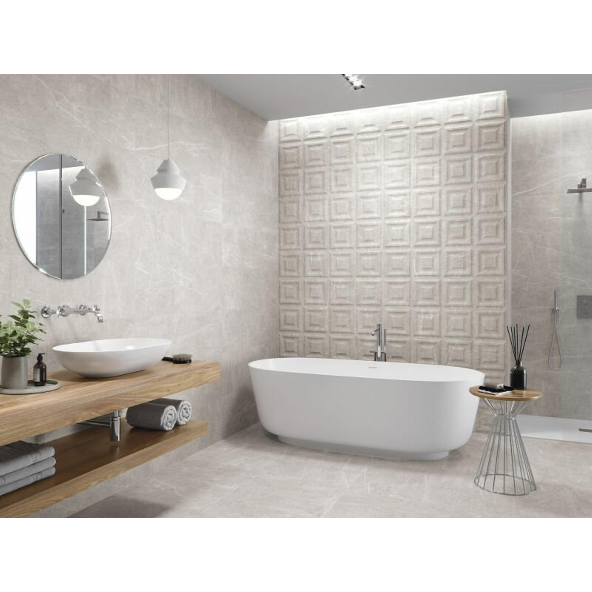 Avec ce carreau mural aspect marbre dans une douce teinte de gris, vous faites entrer chez vous l’apparence luxueuse de la pierre naturelle, sans la sensibilité et l’entretien qui l’accompagnent souvent. Le format allongé de 33x100 cm se prête parfaitement aux murs continus et apaisants de la salle de bains, des toilettes ou de la cuisine, mais aussi à un mur d’accent élégant derrière la baignoire ou le lavabo. Grâce à la surface mate, le carreau a un aspect à la fois moderne et intemporel, ce qui lui permet de se marier à merveille avec les tons bois, les robinets noirs ou la céramique sanitaire blanche. Si vous recherchez une base contemporaine et naturelle qui dure des années et ne lasse pas rapidement, il s’agit d’un choix judicieux. Surtout si vous aimez l’apparence luxueuse du marbre, mais optez pour la facilité d’utilisation et la fiabilité de la céramique.