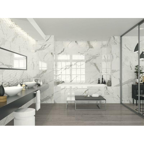 Ce carrelage mural est en réalité rectifié et proposé dans un grand format rectangulaire de 40x120 cm. L’échantillon a été volontairement réduit à un morceau maniable (maximum 20x20cm), mais montre précisément la finition des bords, la brillance et la structure. Dans la pratique, les bords rectifiés signifient que vous pouvez travailler avec des joints fins pour un ensemble presque sans couture, ce qui rend l’aspect marbre encore plus sobre et luxueux. Idéal si vous aimez un jeu de lignes épuré dans votre revêtement mural, par exemple derrière la baignoire, le long de la douche à l’italienne ou comme mur d’accent continu. Avec l’échantillon, vous pouvez facilement évaluer si le format, l’apparence et la couleur du joint que vous avez en tête s’accordent bien.