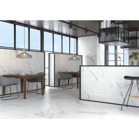 Ce carrelage dégage style et classe grâce à la finition statuario mat et aux bords rectifiés qui assurent une installation sans joint. L'apparence marbrée donne une sensation de luxe et de raffinement à chaque espace dans lequel il est utilisé. La combinaison de blanc et noir crée un contraste élégant qui attire l'attention et génère une apparence moderne.