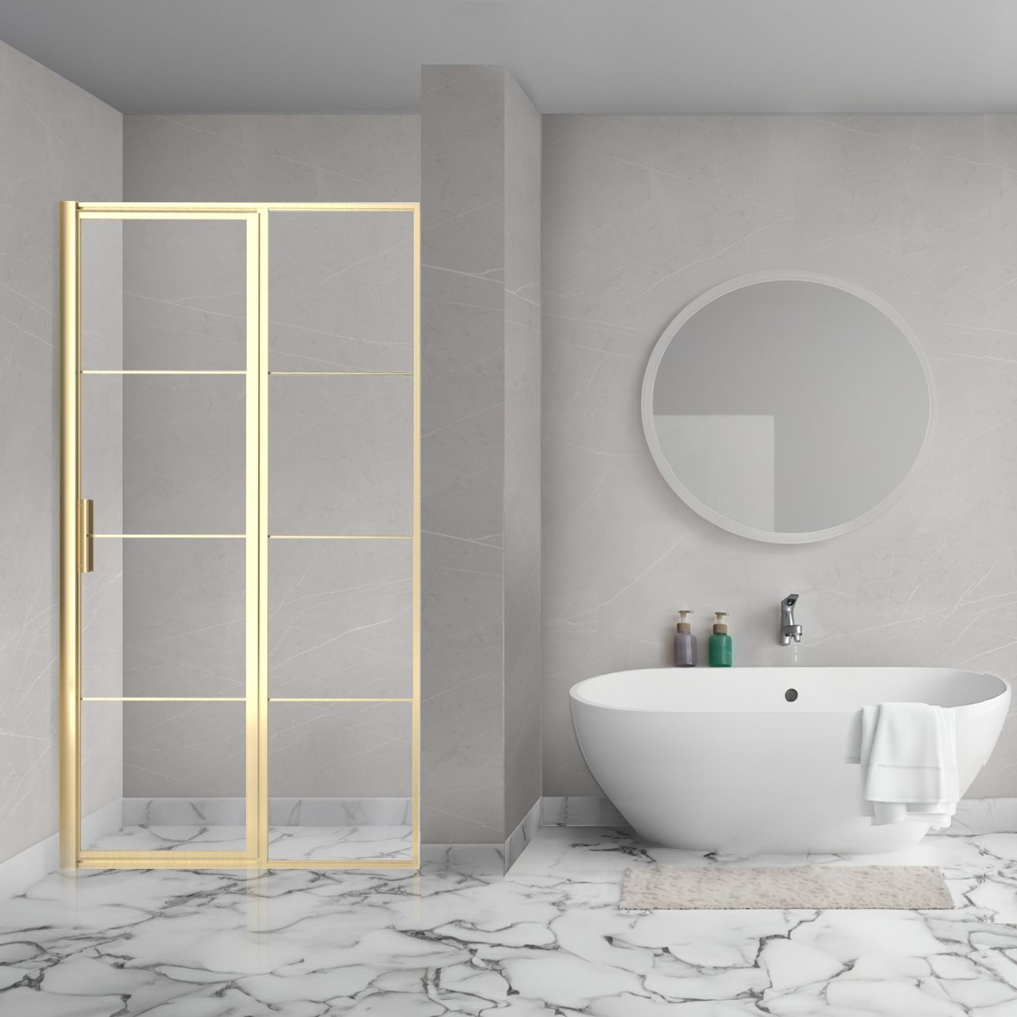 La Aqua Vista Triple Porte pivotante avec partie fixe - 120x200 cm - verre transparent - laiton brossé (or est une paroi de douche élégante pour tous ceux qui recherchent une solution de douche luxueuse et intemporelle. Cette porte pivotante avec partie fixe s'intègre parfaitement dans une salle de bains moderne, industrielle ou classique grâce au verre transparent et au profilé en laiton brossé qui se marient facilement avec différents carreaux et équipements sanitaires. Grâce à ses dimensions généreuses de 120x200 cm, vous créez une douche à l'italienne confortable avec beaucoup d'espace de mouvement et une impression d'ouverture. Cette paroi de douche est un choix judicieux si vous souhaitez compléter votre cabine de douche avec des parois de douche de qualité, une quincaillerie solide et une finition haut de gamme.