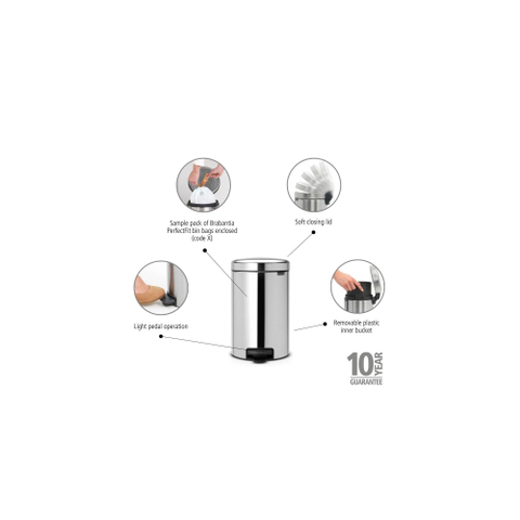 Brabantia NewIcon Poubelle à pédale - 12 litres - seau intérieur en plastique - acier brillant