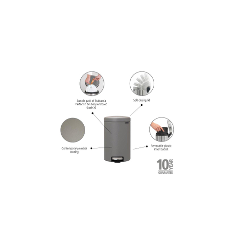 Brabantia NewIcon Poubelle à pédale - 12 litres - seau intérieur en plastique - gris béton minéral