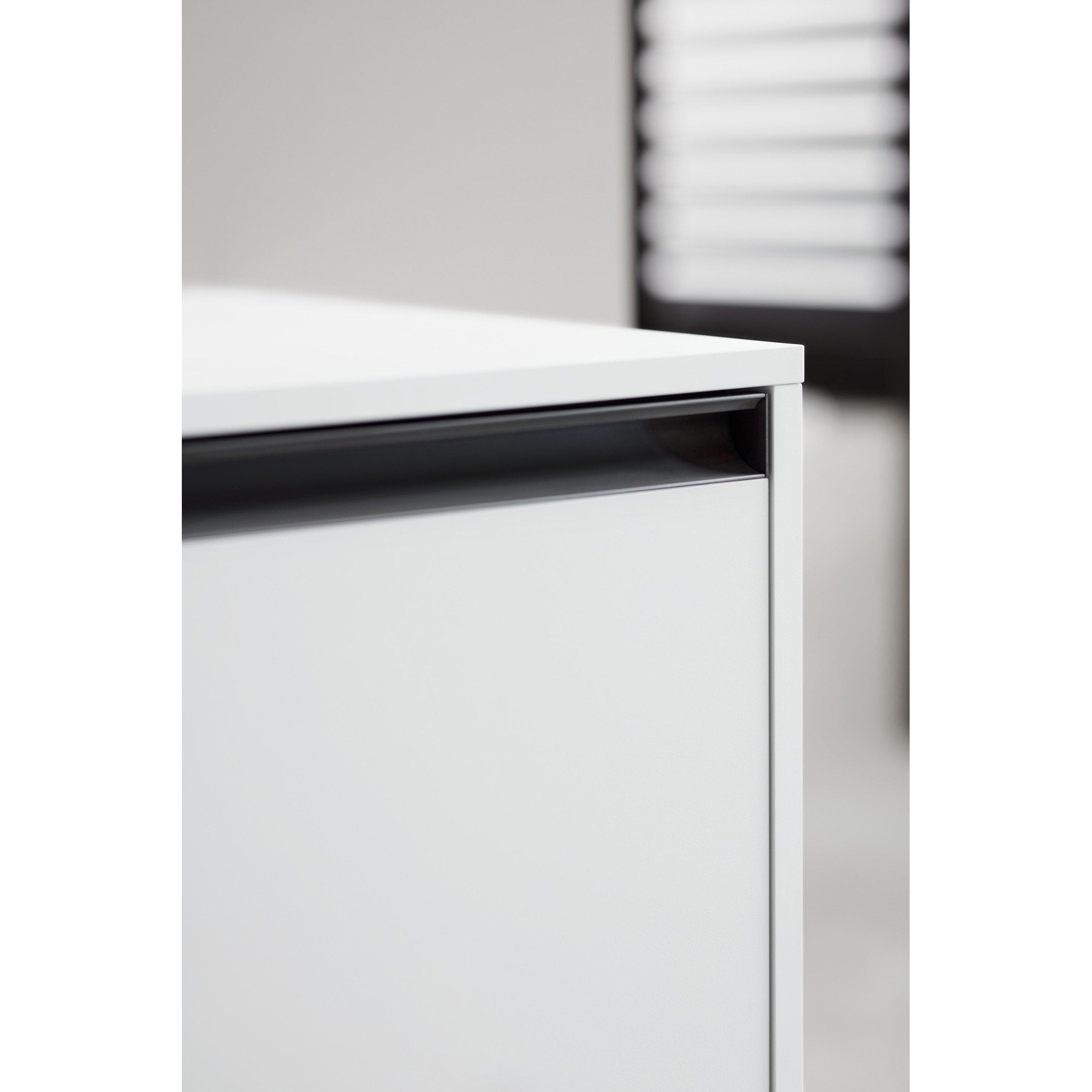 La finition blanche supermate confère au meuble une apparence luxueuse et sobre, sans brillance marquée. Ce n’est pas seulement joli dans les salles de bains contemporaines et scandinaves, mais aussi étonnamment élégant dans un environnement plus industriel avec des tons béton ou bois. Le blanc mat est en outre indulgent à l’usage quotidien : les empreintes digitales et les petites gouttes sont moins visibles que sur des surfaces haute brillance, ce qui permet à votre salle de bains de paraître propre plus longtemps. Les poignées anthracite créent un contraste de couleur subtil et facilitent la combinaison de ce meuble avec des robinets et des accessoires noirs ou foncés. Vous pouvez ainsi créer intelligemment une palette de couleurs harmonieuse sans surcharger l’espace.