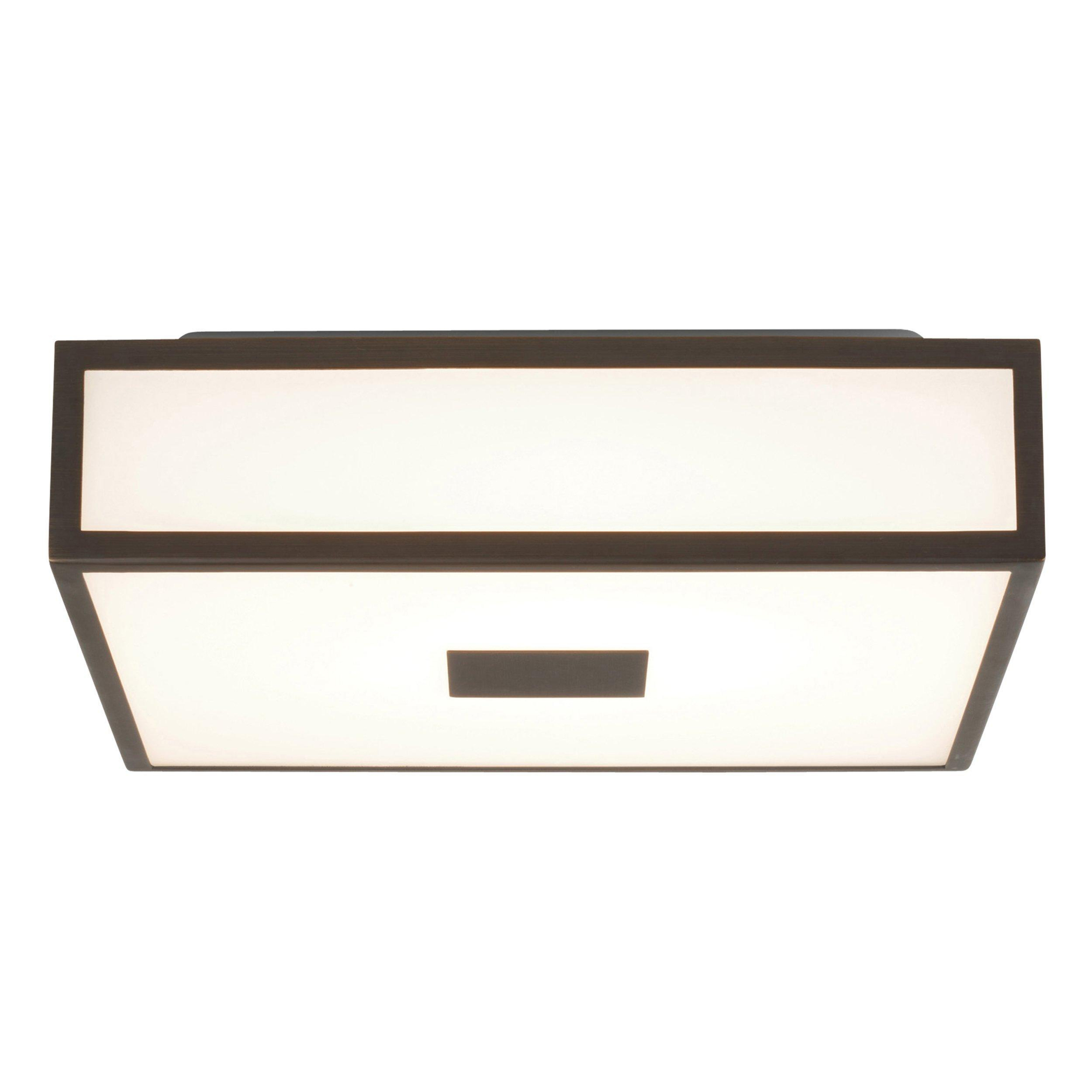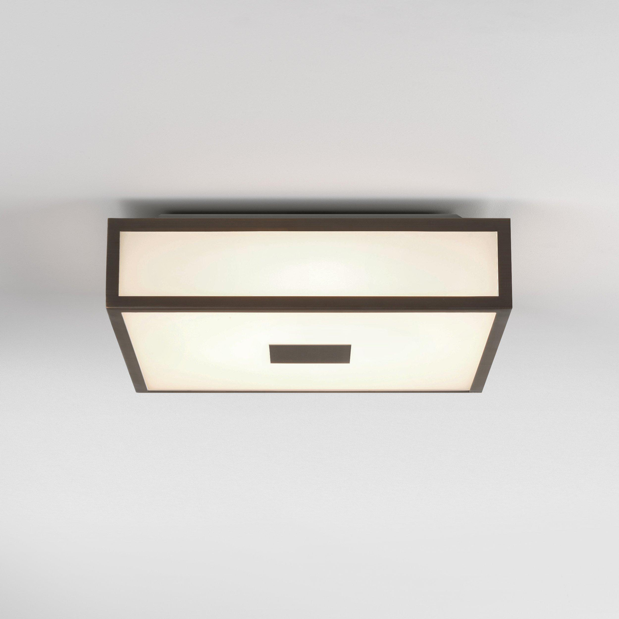 - Plafonnier carré avec élégante finition bronze, adapté aux salles de bains classiques comme modernes.