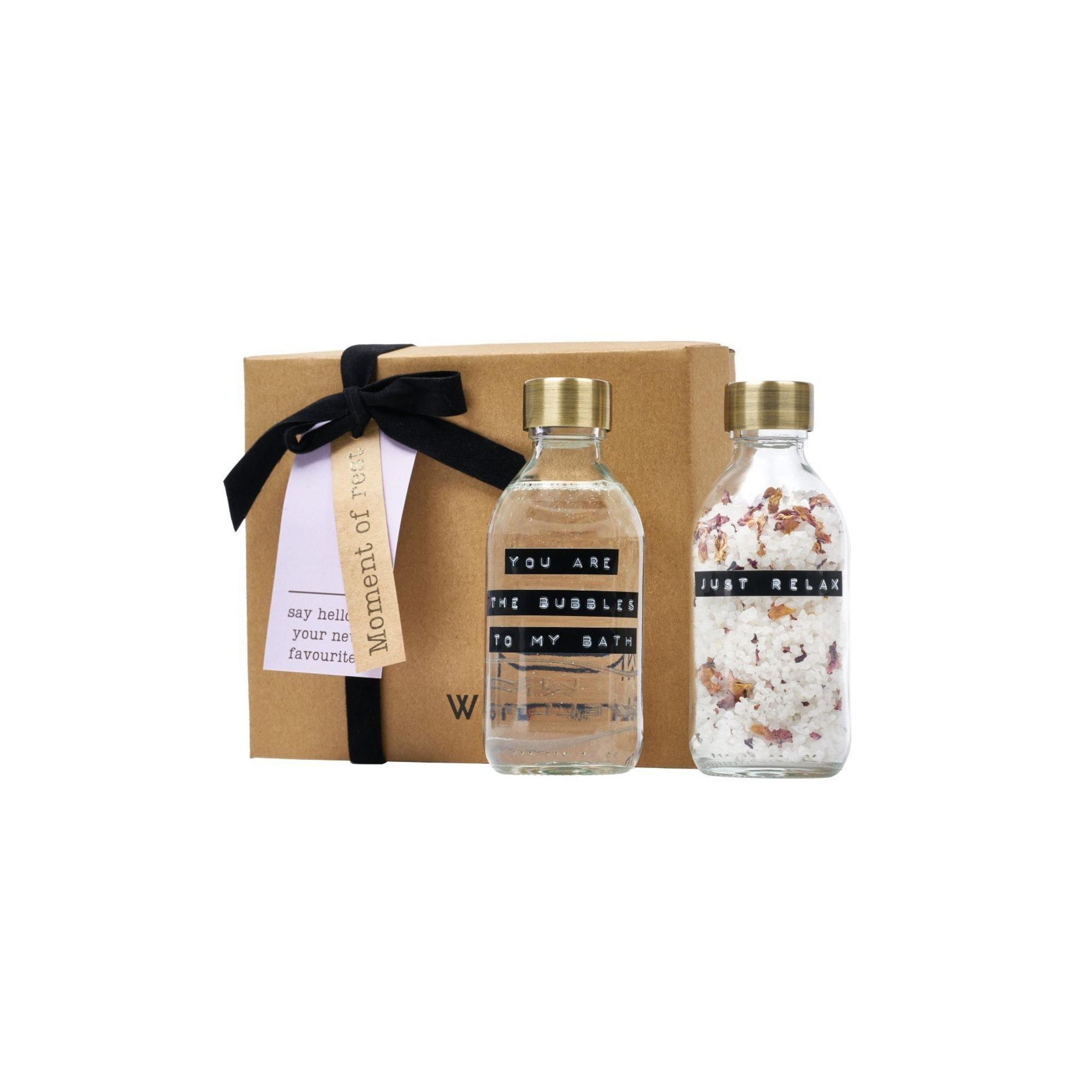 Wellmark Coffret cadeau sel de bain en savon de bain - 2x200ml - transparent/laiton - texte : MOMENT OF REST