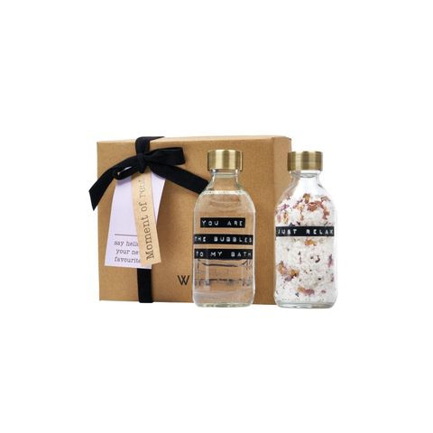 Wellmark Giftbox sels de bain & savon de bain - 2x200ml - transparent/laiton - texte : MOMENT DE REPOS
