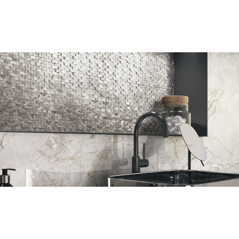 - Mosaïque couleur argent avec aspect moderne et unique pour application murale intérieure.