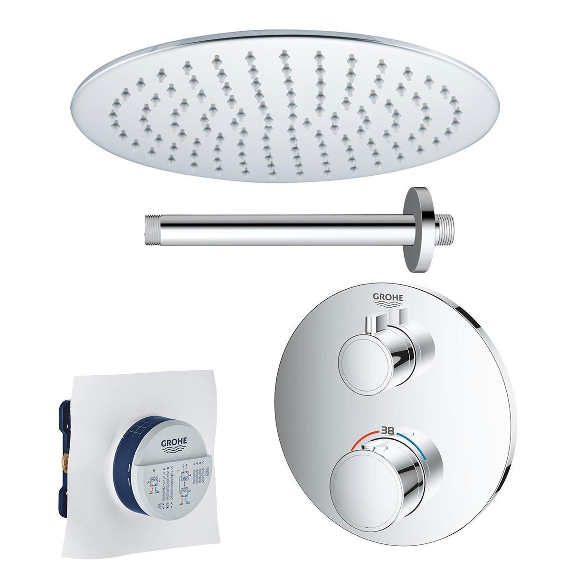 Grohe - Adema Rise Ensemble de douche pluie encastré - 1 fonction - avec pomme de tête Adema Rise 30cm - bras plafond 20cm - Grohe Grohtherm mitigeur thermostatique encastré - chrome