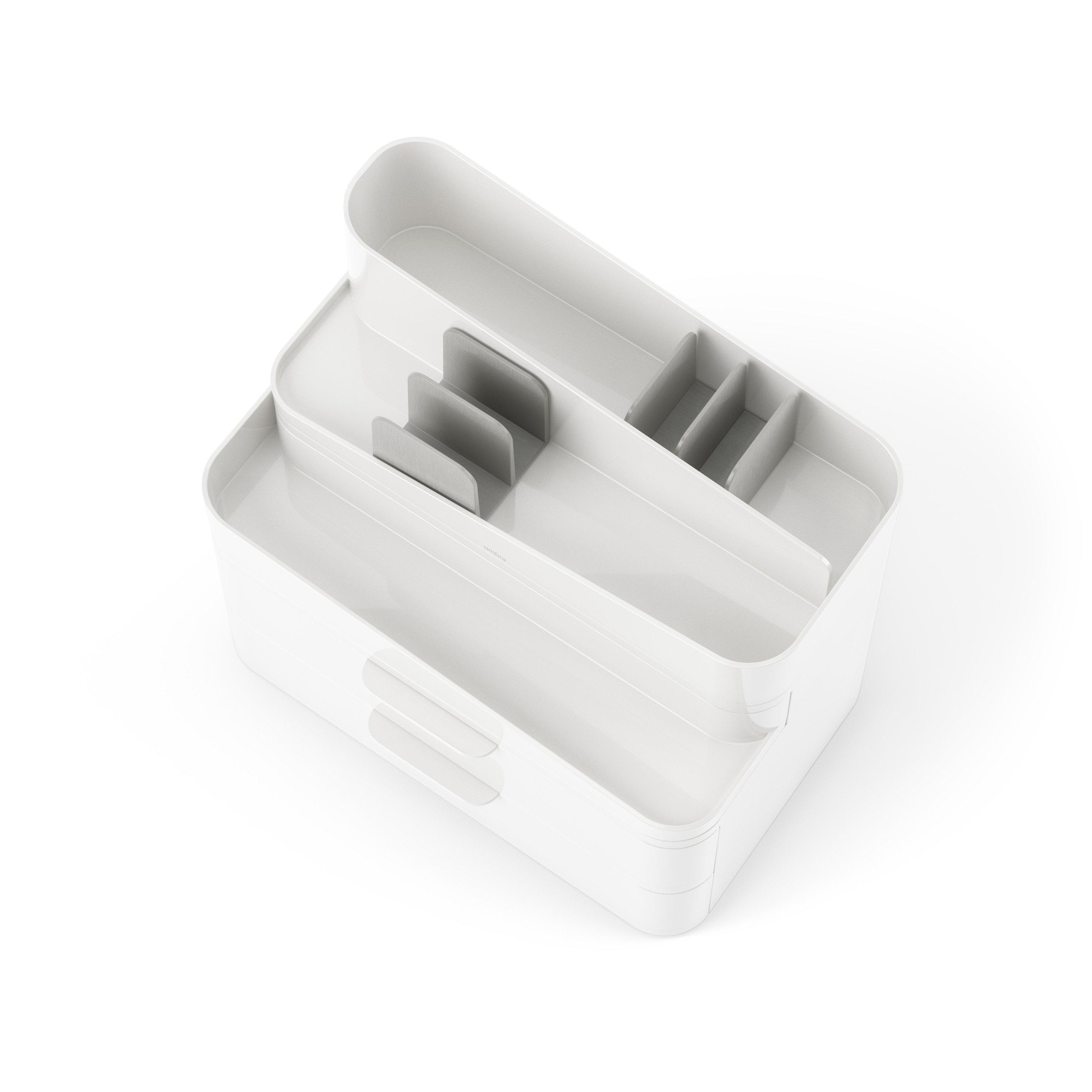 Avec sa base blanche lumineuse et ses accents gris subtils, cet organiseur s’intègre parfaitement dans les salles de bains modernes, mais aussi sur une coiffeuse dans la chambre ou sur votre bureau dans le home office. Ses lignes épurées dégagent de la tranquillité, de sorte qu’il n’est pas trop présent, mais contribue justement à une apparence ordonnée. Grâce à sa conception modulaire, vous pouvez empiler les éléments ou les utiliser séparément, par exemple une partie sur le lavabo et une autre partie dans un tiroir. Vous utilisez ainsi de façon optimale l’espace disponible et créez un système de rangement qui évolue avec vos besoins. Cela en fait également un cadeau très réussi pour tous ceux qui aiment vivre de manière organisée et élégante.
