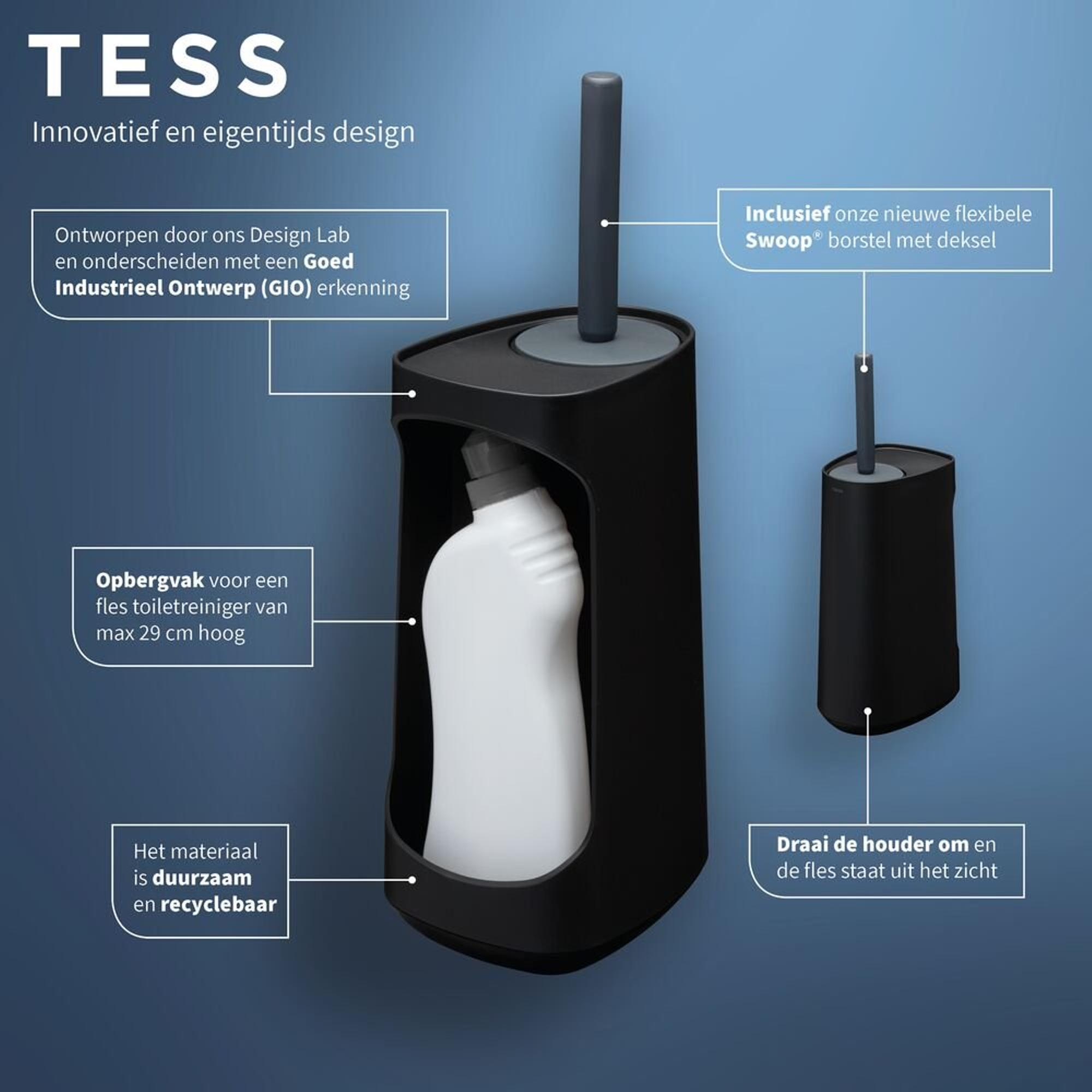 La fonction de rangement intégrée fait toute la différence au quotidien. Dans le compartiment supplémentaire, vous placez facilement un flacon de nettoyant WC, afin de ne plus devoir chercher dans les placards ou les paniers. Vous prenez le flacon, nettoyez rapidement les toilettes puis le replacez soigneusement dans son espace dédié. Retournez le porte-balai et tout est immédiatement hors de la vue, ce qui crée un aspect calme et ordonné dans ce petit espace. Dans les WC compacts en particulier, chaque centimètre compte ; en regroupant tout dans une unité épurée, vous créez une meilleure vue d’ensemble et évitez les flacons qui traînent. C’est non seulement plus esthétique, mais aussi plus pratique et plus hygiénique, car vos produits d’entretien sont rangés en toute sécurité et en position verticale.