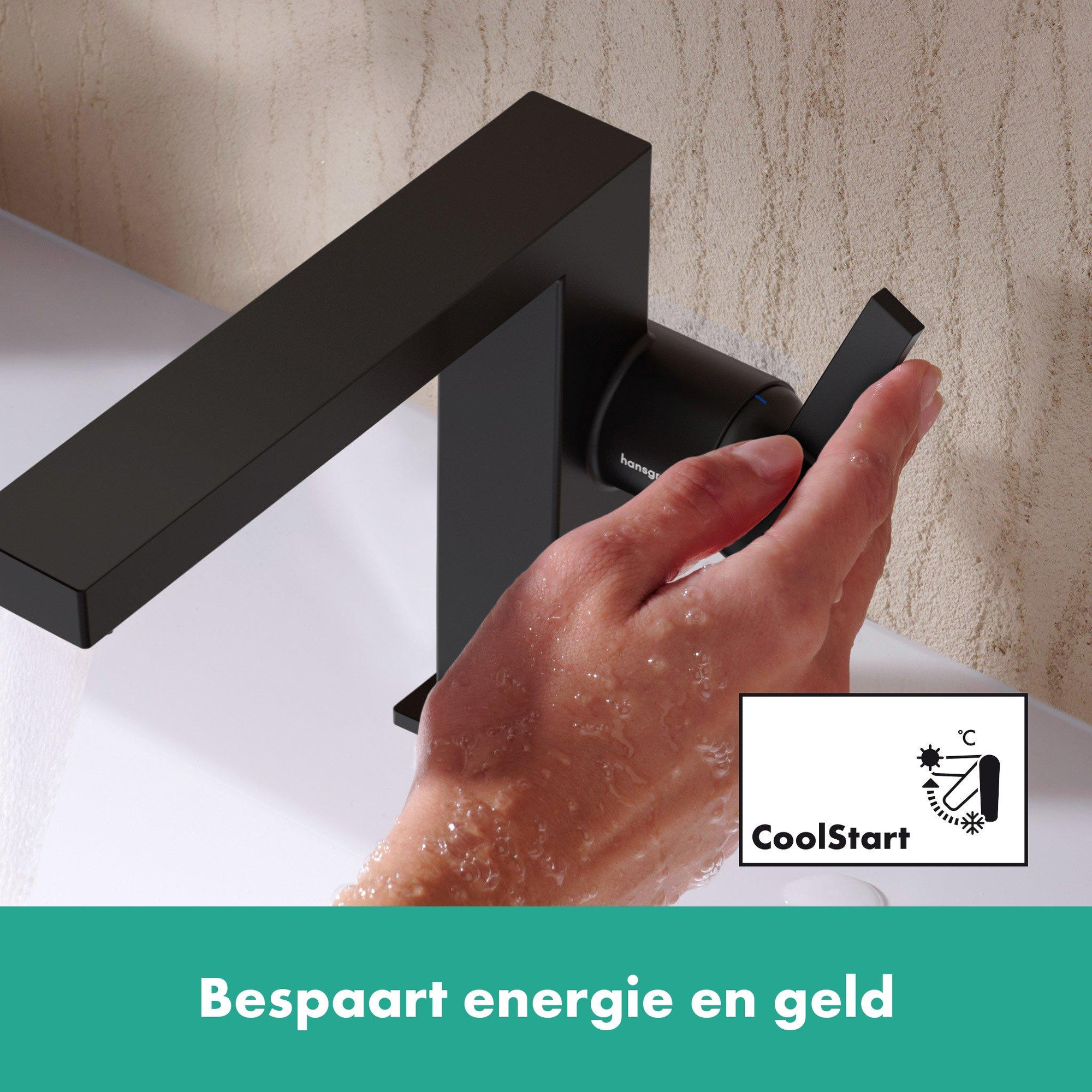 Avec ce mitigeur, vous choisissez un produit qui est non seulement beau, mais aussi durable. Grâce à la technologie EcoSmart+, vous consommez jusqu’à 20 % d’eau en moins qu’avec des robinets standards, sans perte de confort. Le robinet délivre un jet d’eau plein enrichi en air (AirPower), ce qui réduit les éclaboussures et procure une sensation agréable sur la peau. En outre, vous économisez de l’énergie grâce à la fonction CoolStart : le robinet démarre par défaut avec de l’eau froide, évitant ainsi une utilisation inutile d’eau chaude. Vous contribuez ainsi activement à une salle de bains respectueuse de l’environnement.