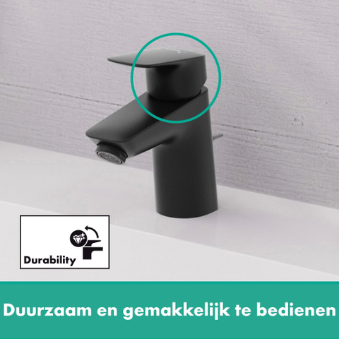 Ce mitigeur est fabriqué avec des matériaux de haute qualité, y compris un vidage métallique à tirette garantissant une longue durée de vie. La cartouche céramique assure une commande fluide et fiable, limitant l’usure. Grâce à la technologie EcoRight, la consommation d’eau est régulée efficacement, avec un débit maximal de seulement 5 litres par minute. Vous économisez ainsi de l’eau sans sacrifier le confort. Cela rend le mitigeur non seulement écologique, mais aussi économique à long terme.