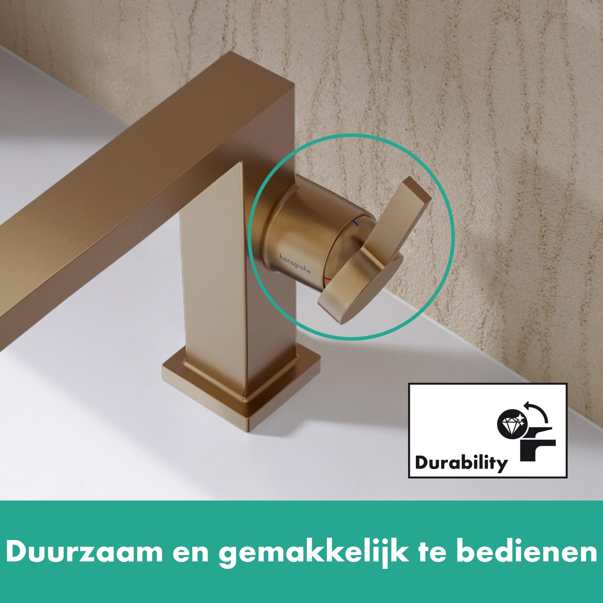 Le robinet se distingue par son design puriste aux lignes épurées et un bec carré élégant qui s'accorde parfaitement aux tendances modernes de la salle de bains. La finition en bronze brossé offre une apparence chaude et naturelle, à la fois intemporelle et exclusive. Cela en fait un véritable point focal qui s'intègre facilement à divers styles d'intérieur, de l'industriel au classique. Grâce à ce design réfléchi, vous ajoutez non seulement un élément fonctionnel, mais aussi un accent élégant qui complète votre salle de bains.