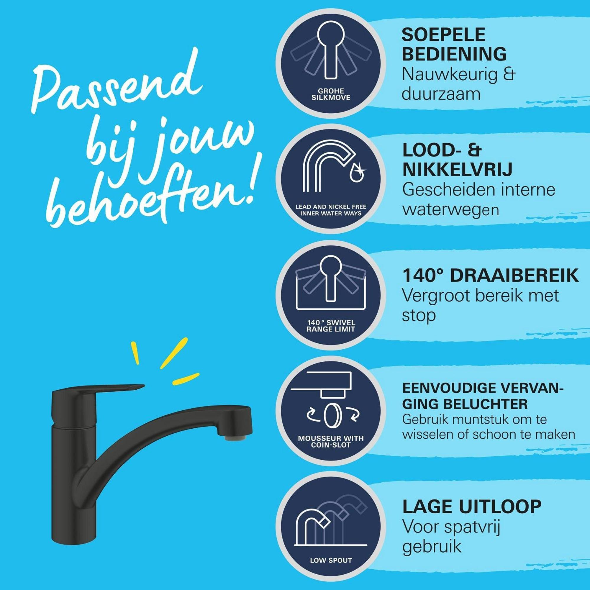 - Finition noire mate avec GROHE Long-Life Finish durable pour une surface résistante aux rayures et sans traces